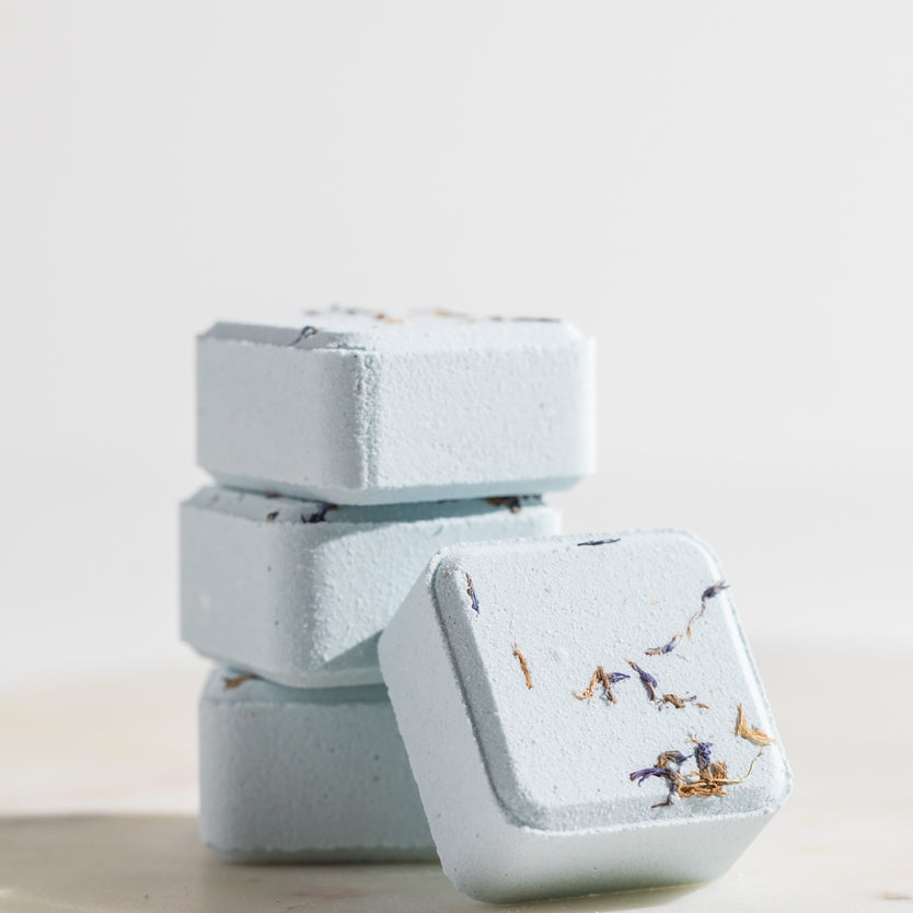 Baking Soda (Sodium Bicarbonate), Citric Acid, Organic Arrowroot Powder, Cambrian Blue Clay, Jasmine Absolute Essential Oil in Jojoba Oil, Organic Lavender Essential Oil, Organic Tea Tree Essential Oil, Witch Hazel, Organic Cornflower Petals