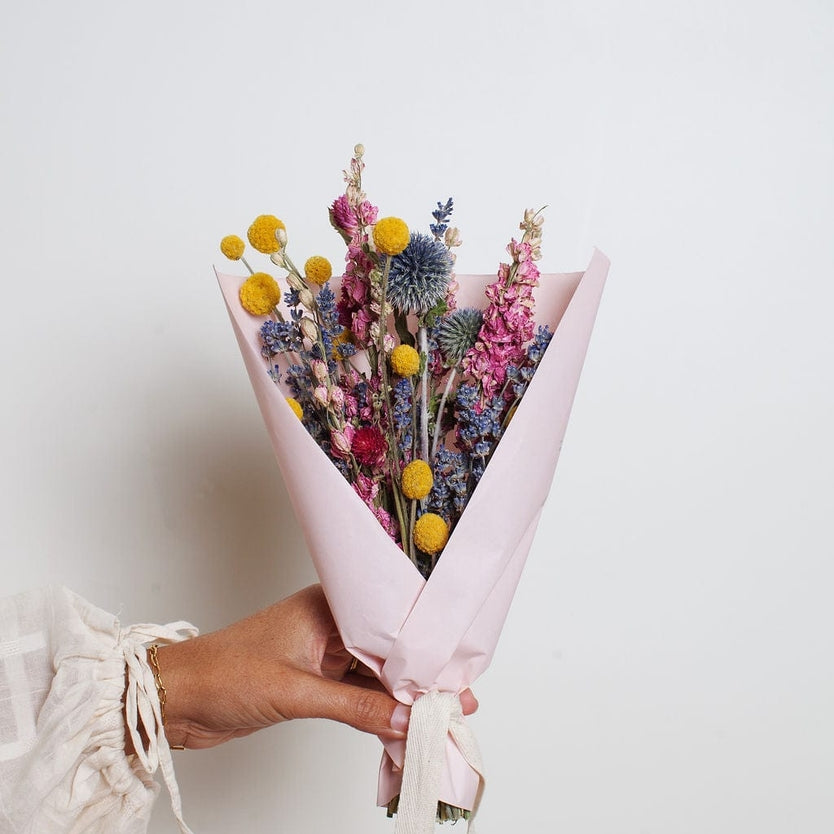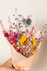 Our Bright Field Bouquet is a cheery mix of fuchsia, yellow and blue florals and greenery. Handcrafted and grown in the USA, each bouquet is made of naturally dried flowers for a lasting touch of nature.