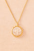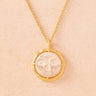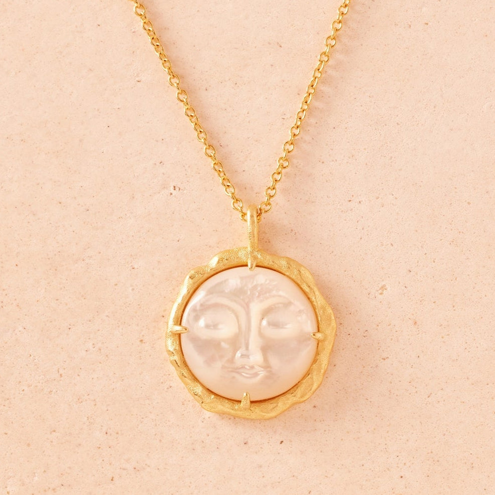 This luminescent mother-of-pearl moonface pendant of our Hëna necklace captures the serene glow of a full moon. Its carved moon face is set in a golden setting and reflects light with peaceful tranquility.