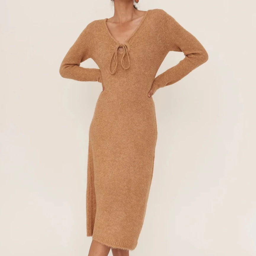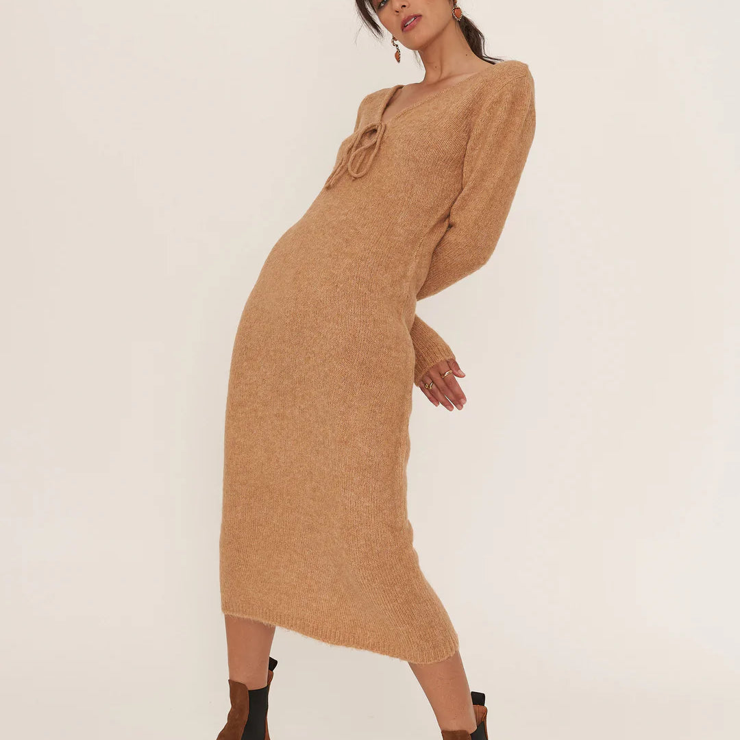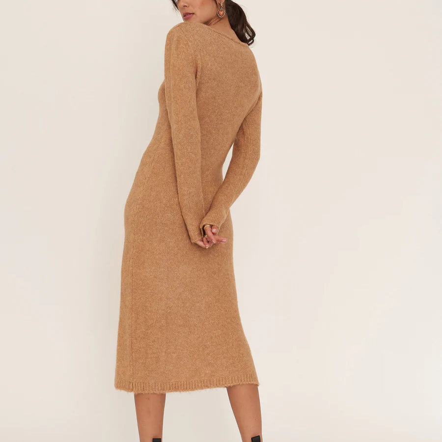 The Stella is a body-hugging midi made of soft and fuzzy yarn with a keyhole detail at the neckline. Perfect for dressing up for a night out or down for a cozy daytime look.