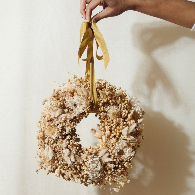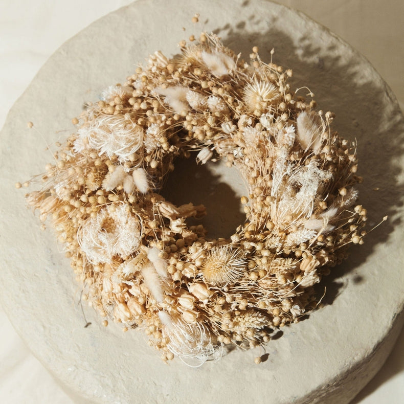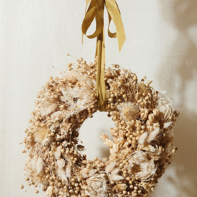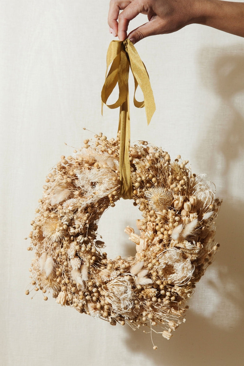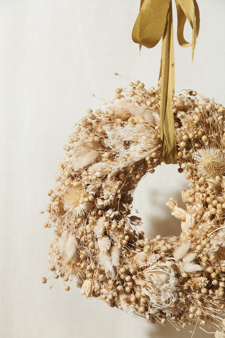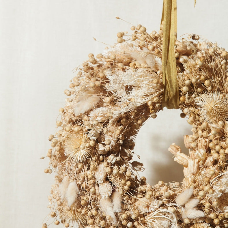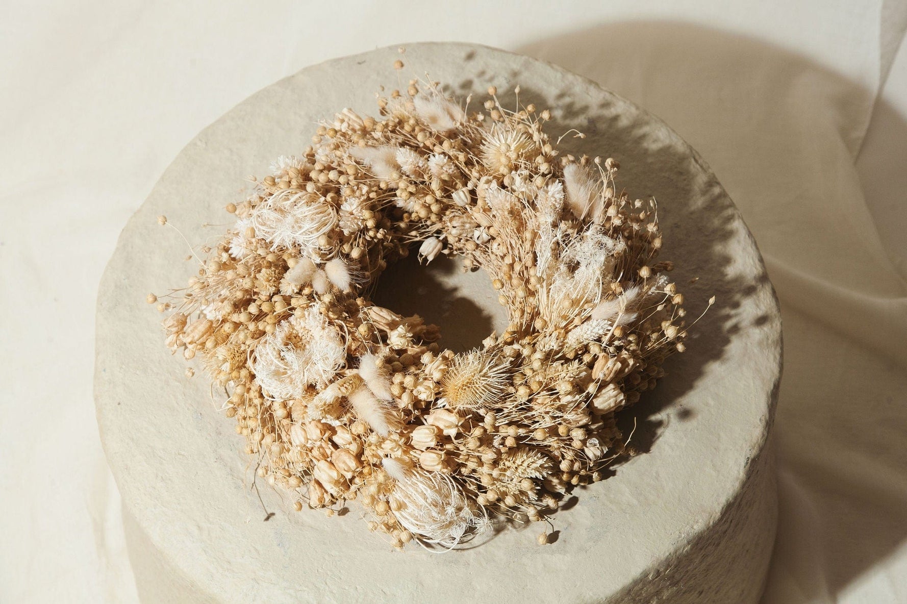 This 12" wreath is composed of everlasting dried flowers in a lovely combination of cream and tan colors, perfect for boho or coastal home decor.