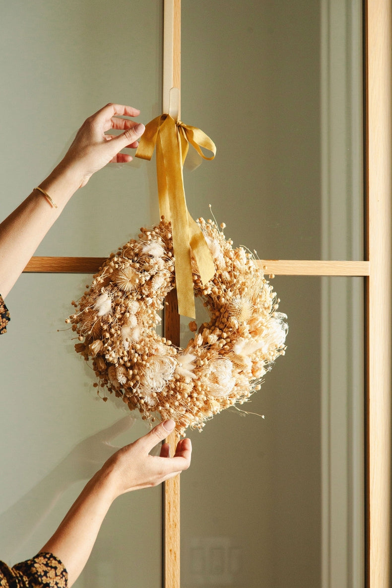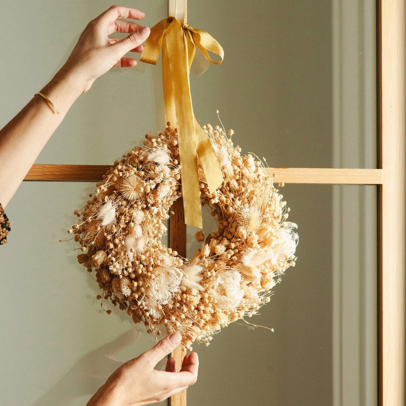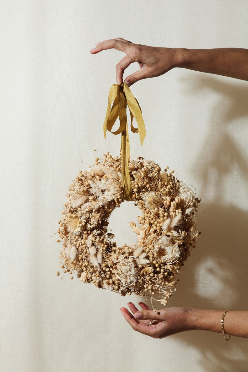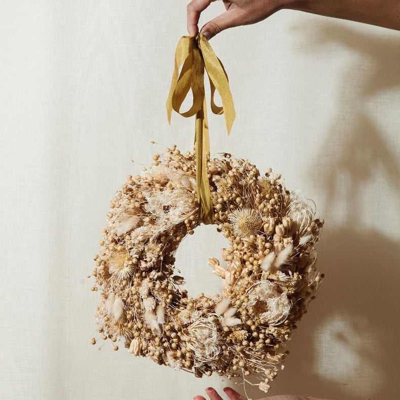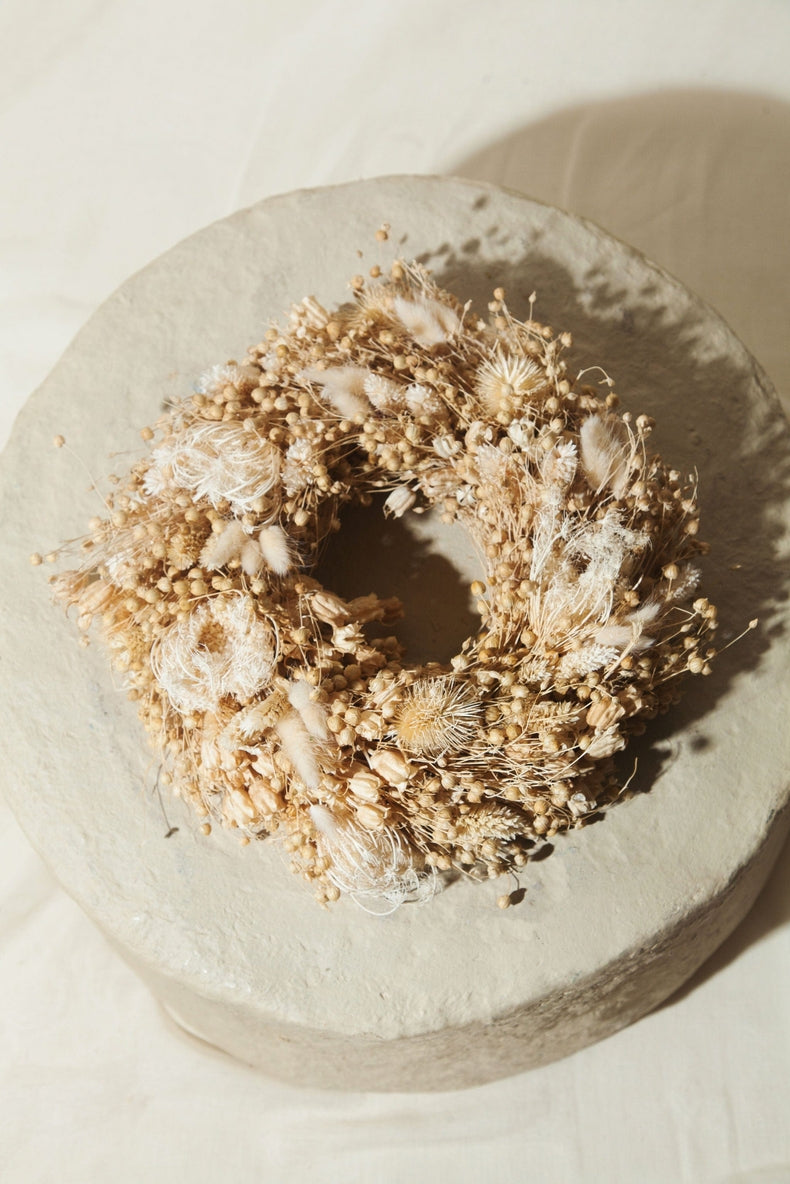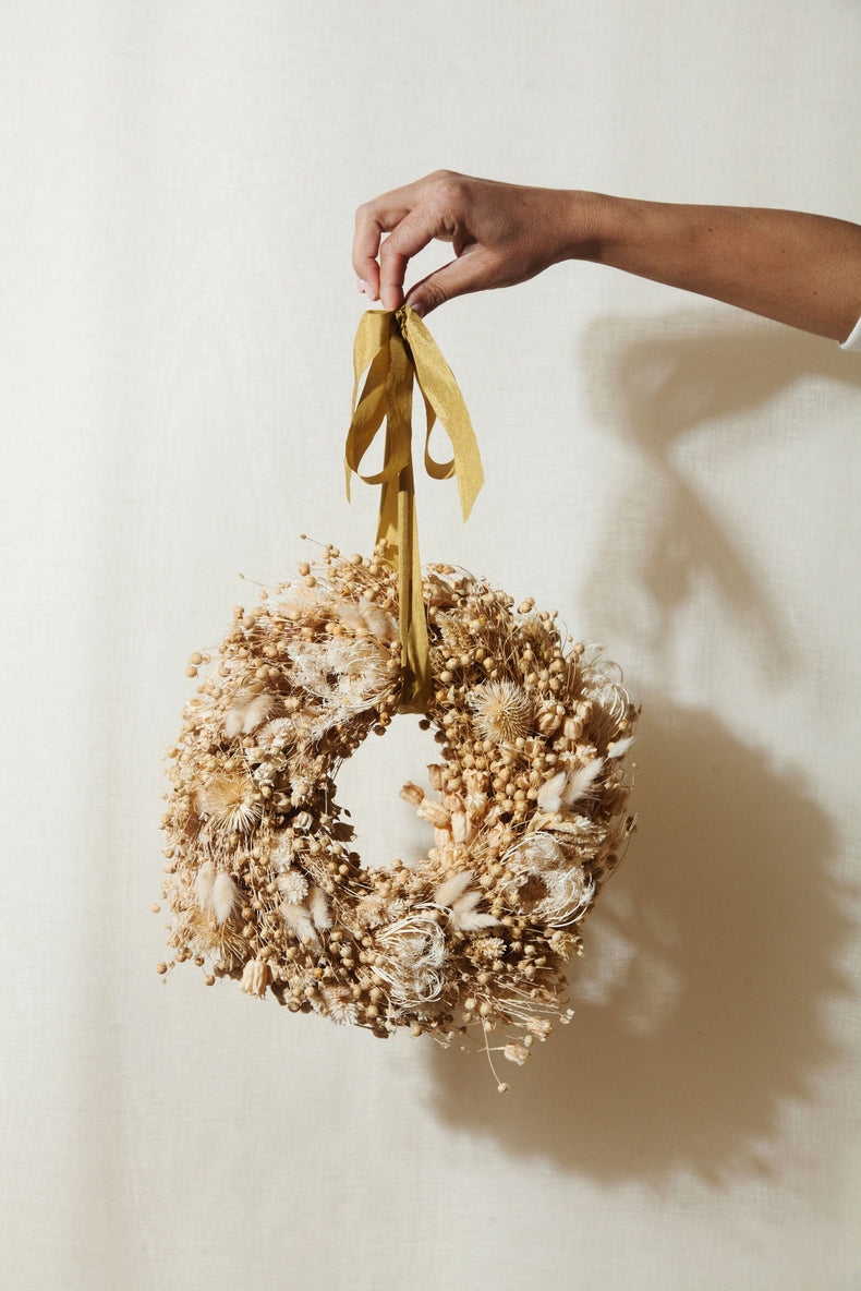 This 12" wreath is composed of everlasting dried flowers in a lovely combination of cream and tan colors, perfect for boho or coastal home decor.