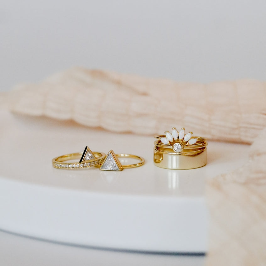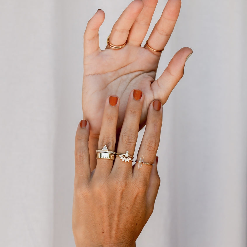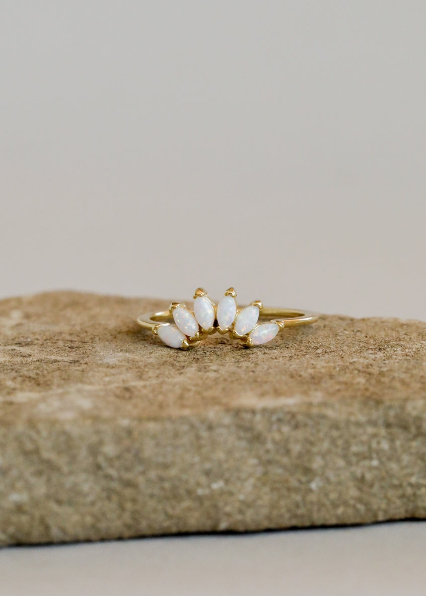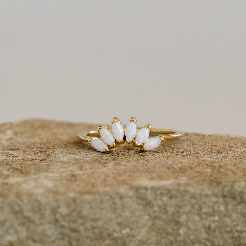 A crown of white opals, to open and strengthen the crown chakra, bringing about optimism, grace, and love to the wearer. Sized just right to cradle and stack from any of our ring assortment. We crafted our collection of rings to make every day a reminder of joy, self-love, and to shine from within.