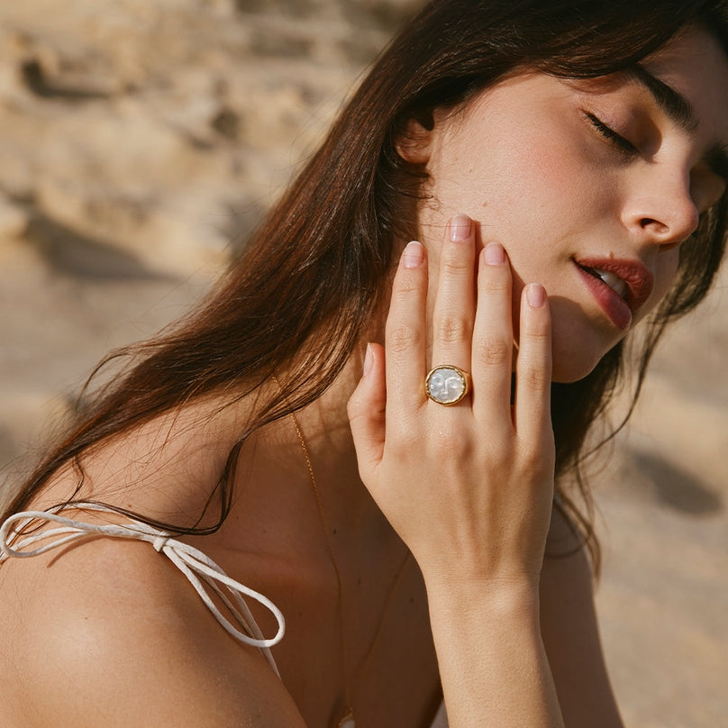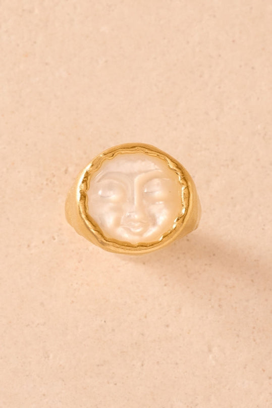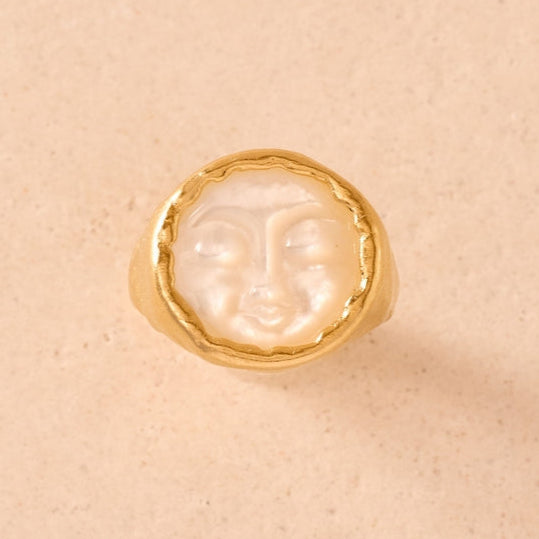 This luminescent mother-of-pearl moonface statement ring captures the serene glow of a full moon. Its carved moon face is set in a golden setting and reflects light with peaceful tranquility.