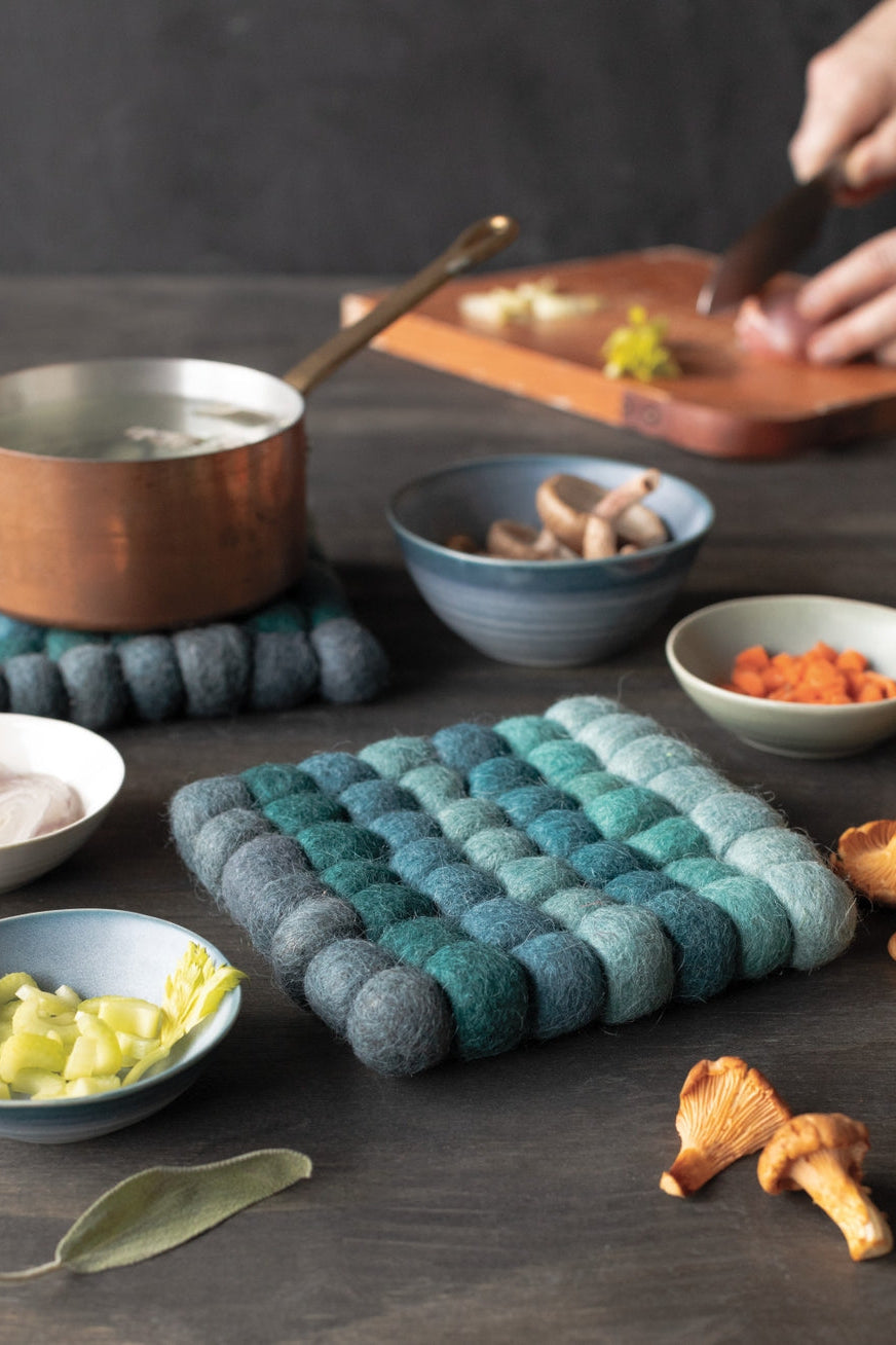 Ombre colors create a kaleidoscope pattern on these cozy woolen trivets. Each sphere is hand-felted and connected creating an unusual, textural statement for the kitchen or table.