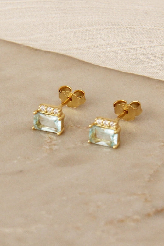 • Featuring a baguette aquamarine stone with pave bar. Please note the image is a close up and appears larger. Please refer to our actual measurement • Material: 18K Gold over 925 Sterling Silver.