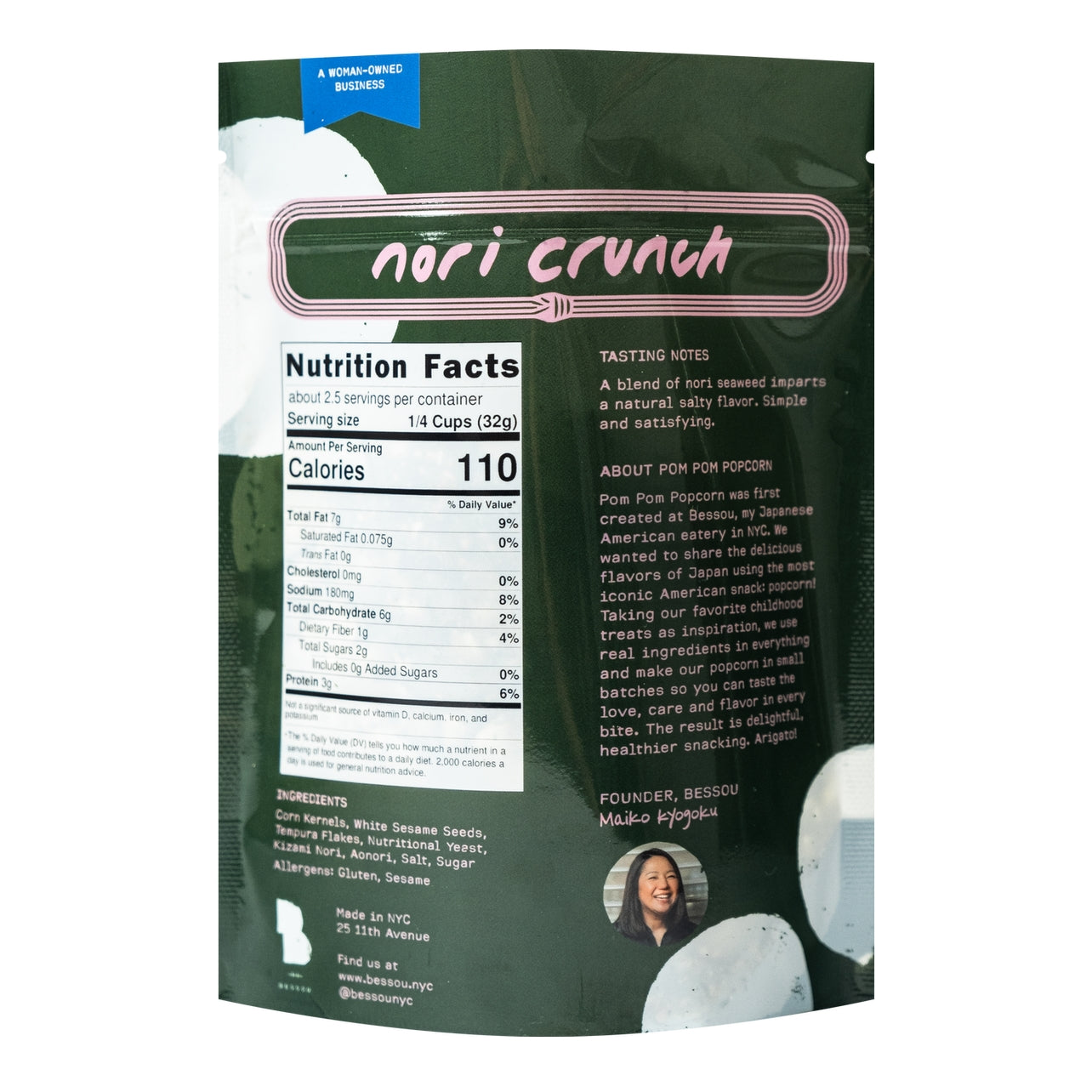 Pom Pom Popcorn was first created at Bessou, my Japanese American eatery in NYC. We wanted to share the delicious flavors of Japan using the most iconic American snack: popcorn! Taking our favorite childhood treats as inspiration, we use real ingredients in everything and make our popcorn in small batches so you can taste the love, care and flavor in every bite. The result is delightful, healthier snacking. Arigato!
