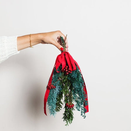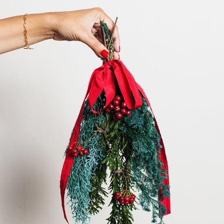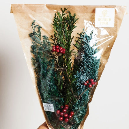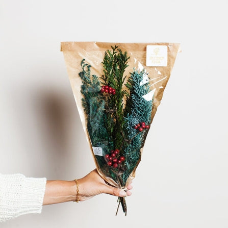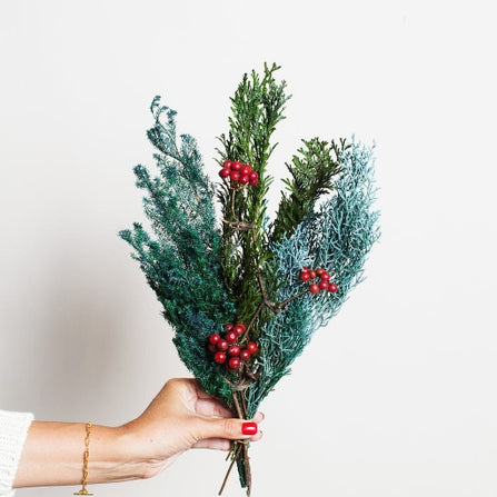 This cheery mix of preserved cedar, fir, cypress and red smilax berries is the perfect Holiday accent. Hang it upside down with a bow for a Christmas wall swag, or use it as an easy table centerpiece for your winter gatherings.