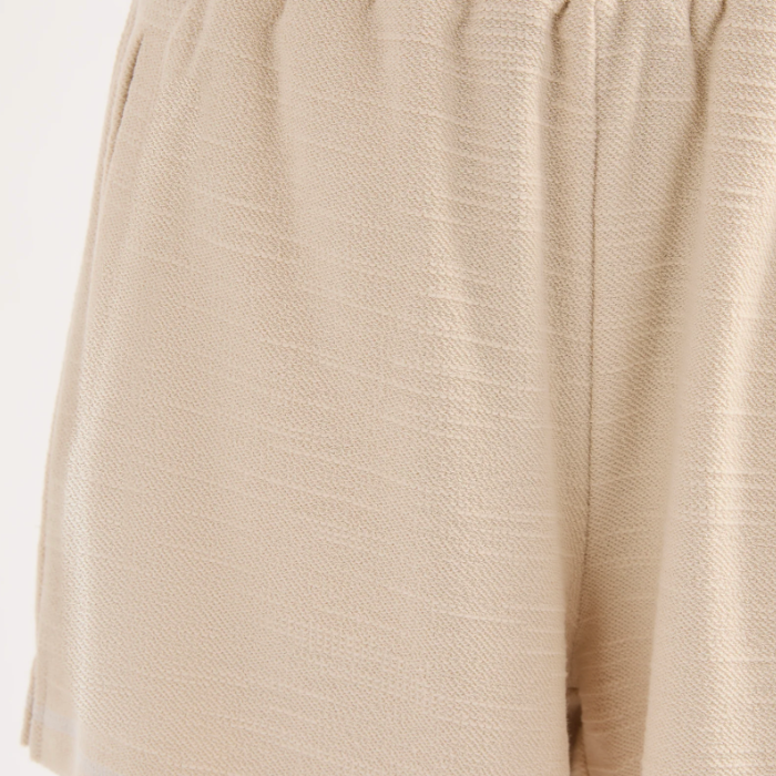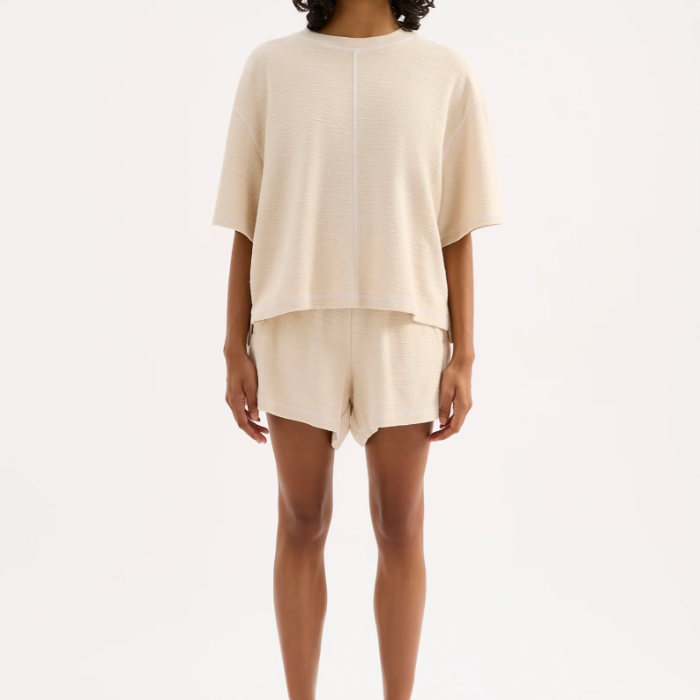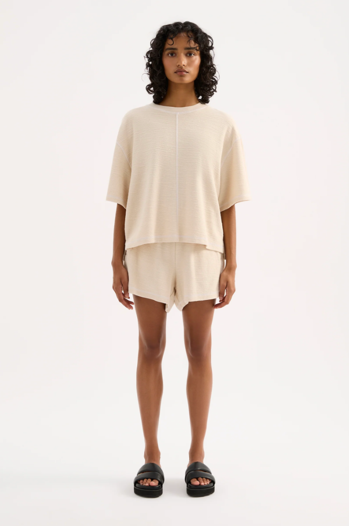The Sutton Short is made from a textured cotton fabrication that is soft on the skin. The silhouette is a clean casual fit with a wide leg opening. Features include an elasticated waistband, side seam pockets and contrast stitching detail.