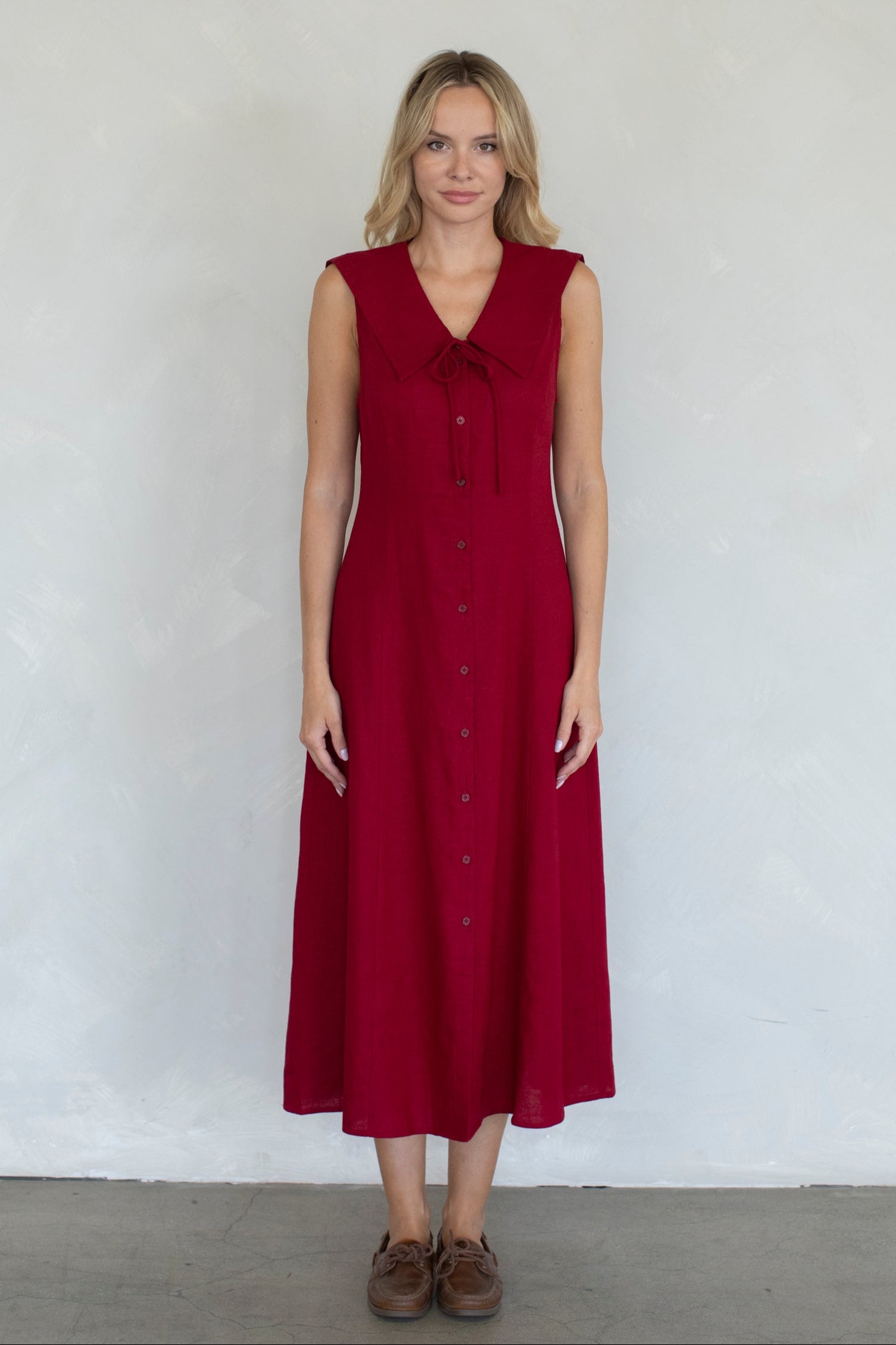 Step into charm with The Sailor Dress, a cherry red midi that brings playful flair to your wardrobe. Featuring a button-down front and a classic sailor collar, it’s perfect for adding a dash of whimsy to any day. Flattering and fun, this dress invites you to make every moment a little more spirited.