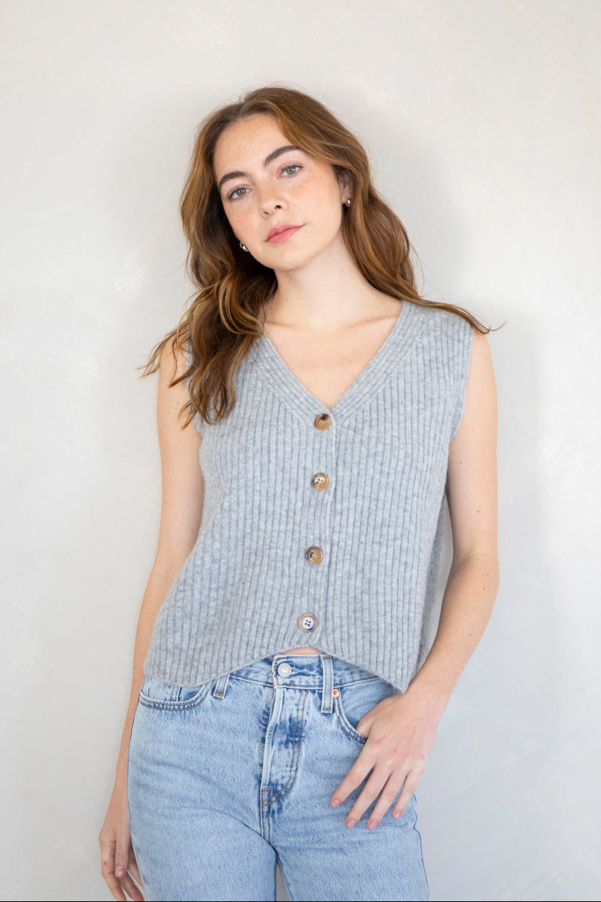 Bring a splash of cozy charm to your outfit with The Sawyer Vest. This grey sweater vest, dotted with warm brown buttons, adds a playful yet stylish layer perfect for any casual day. Easy to mix and match, it’s your new go-to for cozy vibes with a twist of fun.