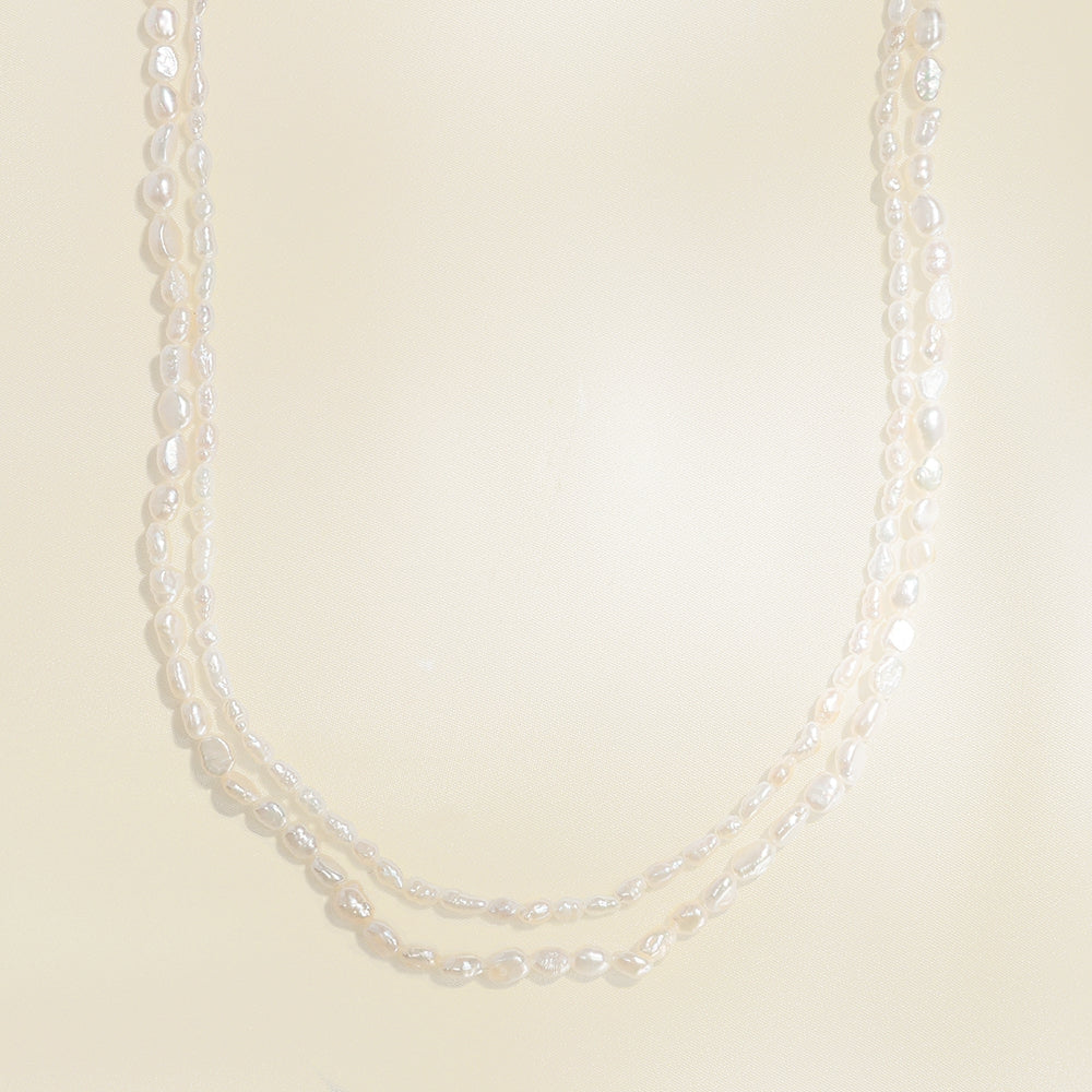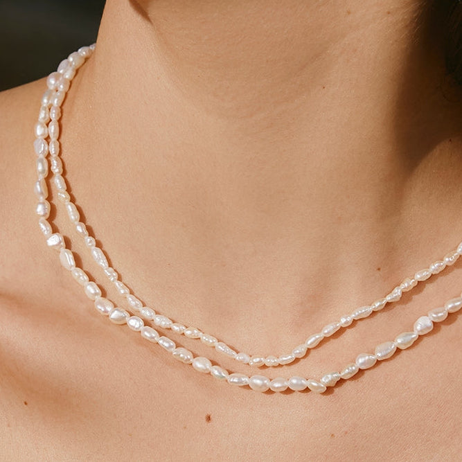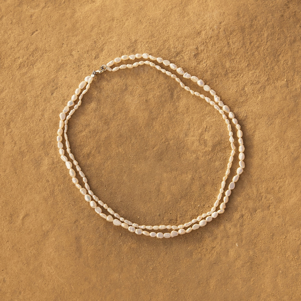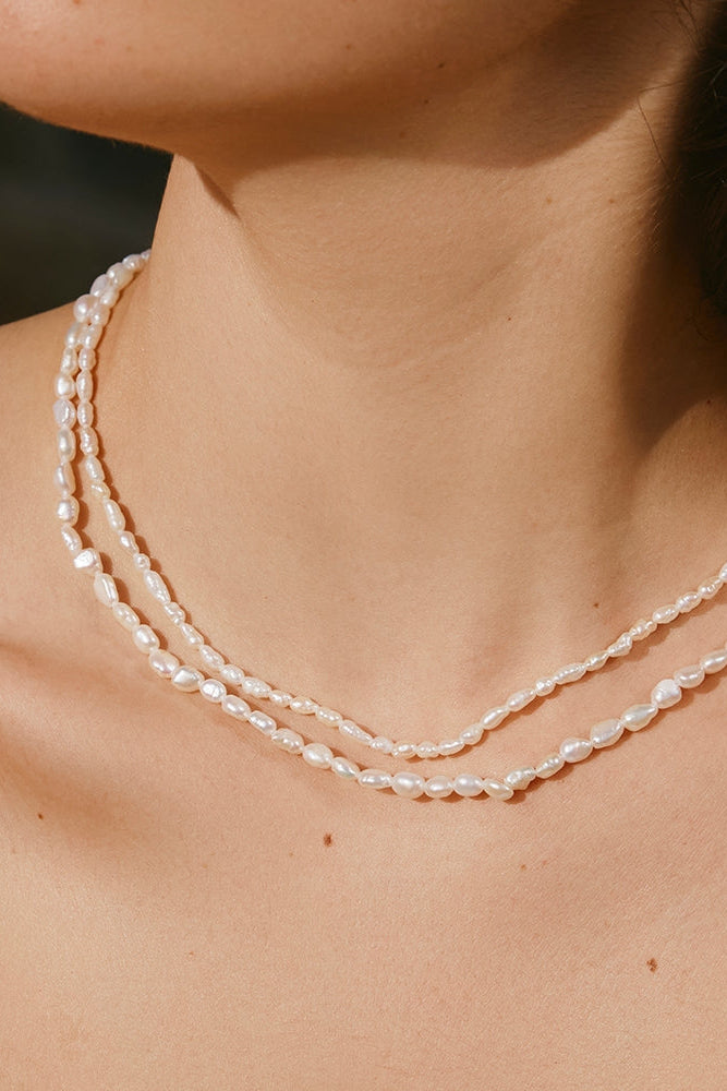 A modern twist on a classic design, our Thira double-strand necklace features one string of oval rice pearls and another, slighly longer, of classic round freshwater pearls. Designed to seamlessly take you from day to night.