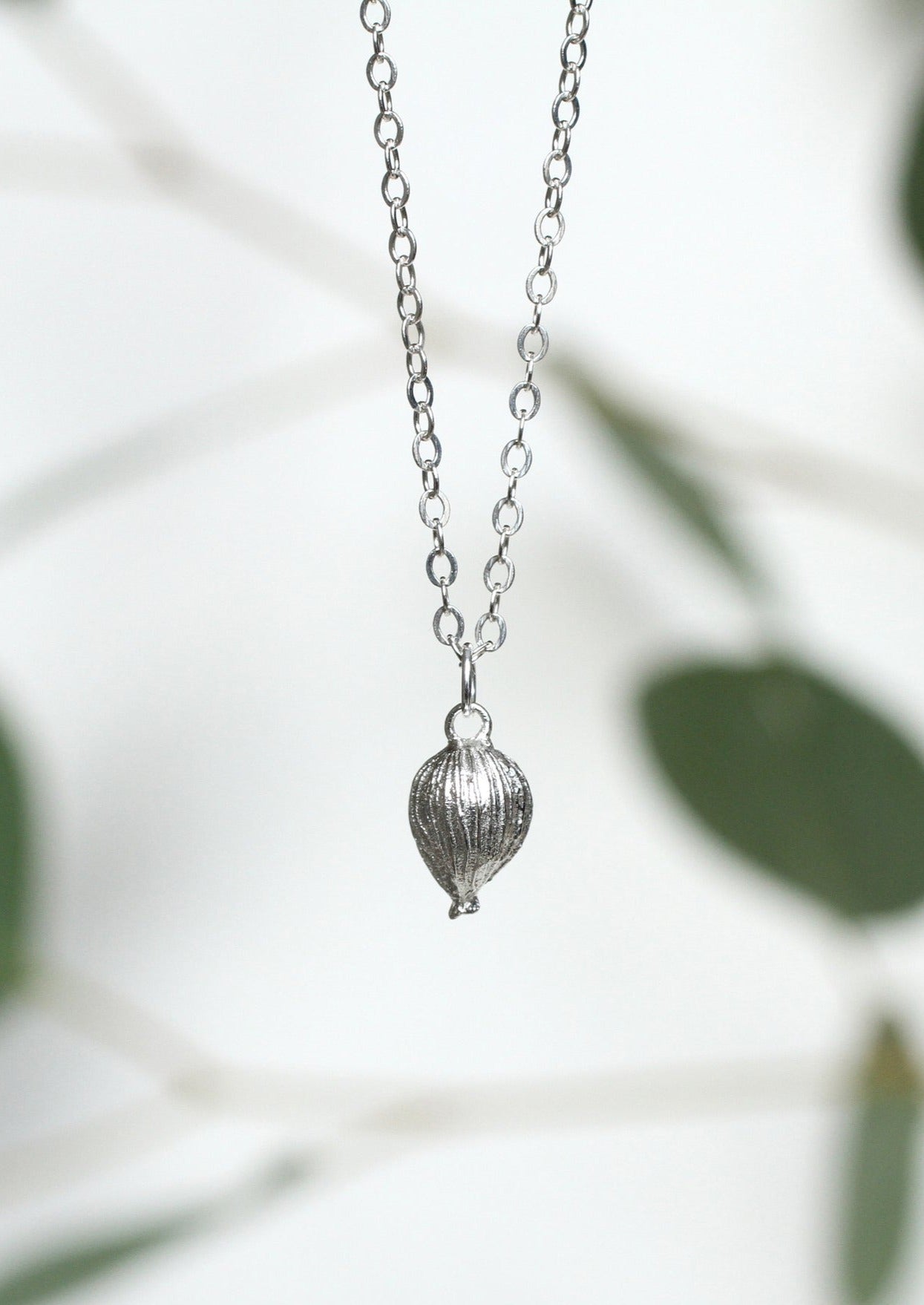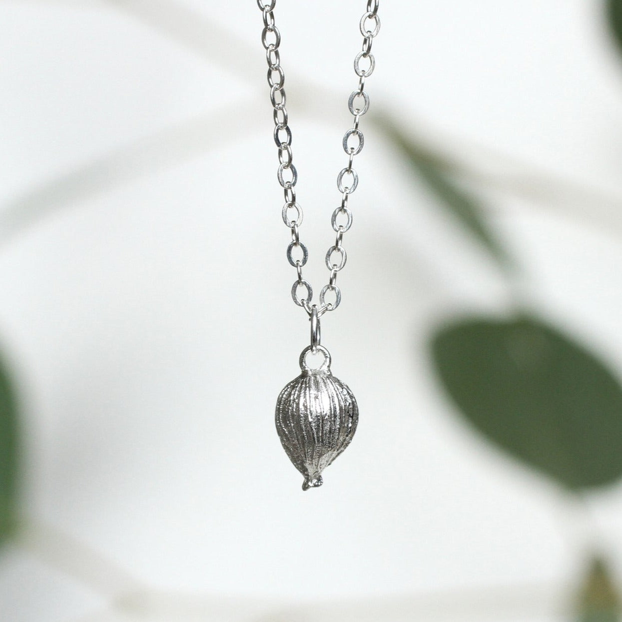 An exact sterling silver casting of an especially tiny, and heart-shaped, cardamom pod.