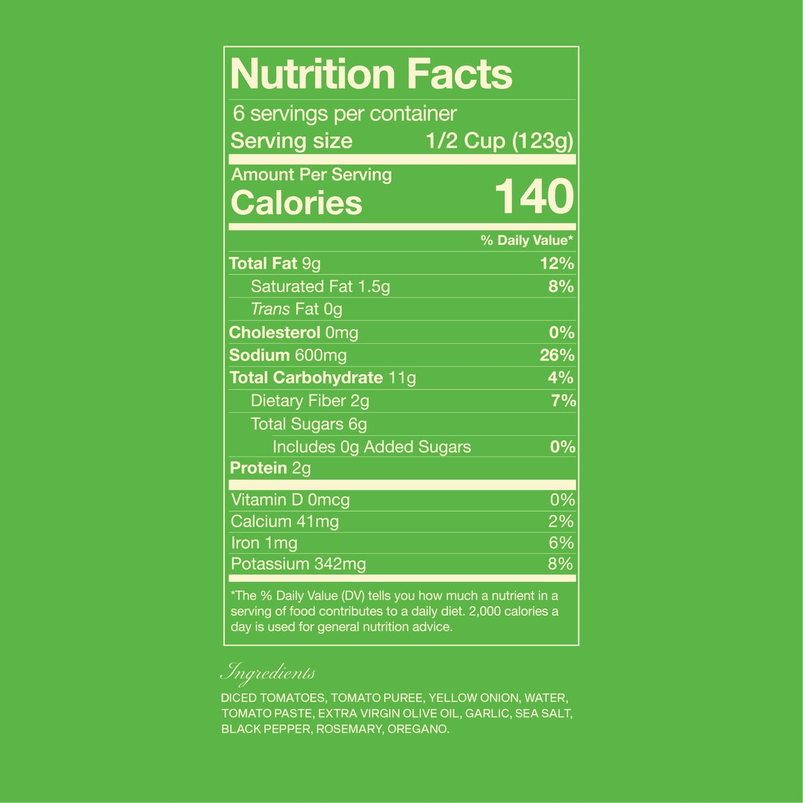 Ingredients: Diced Tomatoes, Tomato Puree, Yellow Onion, Olive Oil, Water, Tomato Paste, Garlic, Sea Salt, Black Pepper, Rosemary, Oregano.