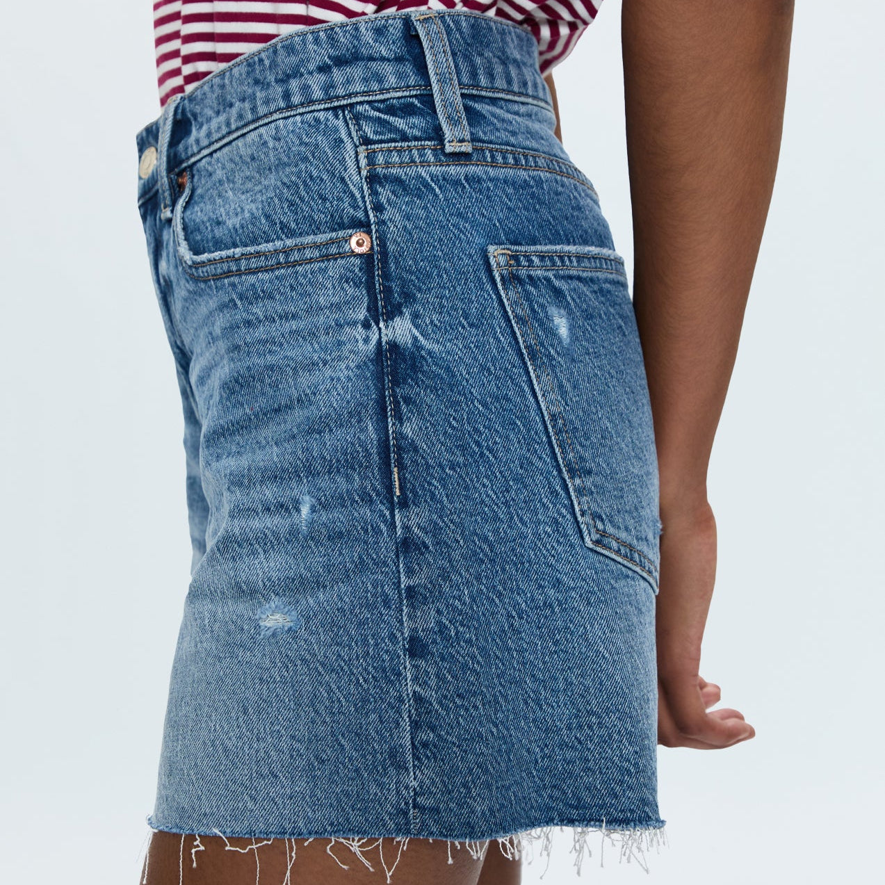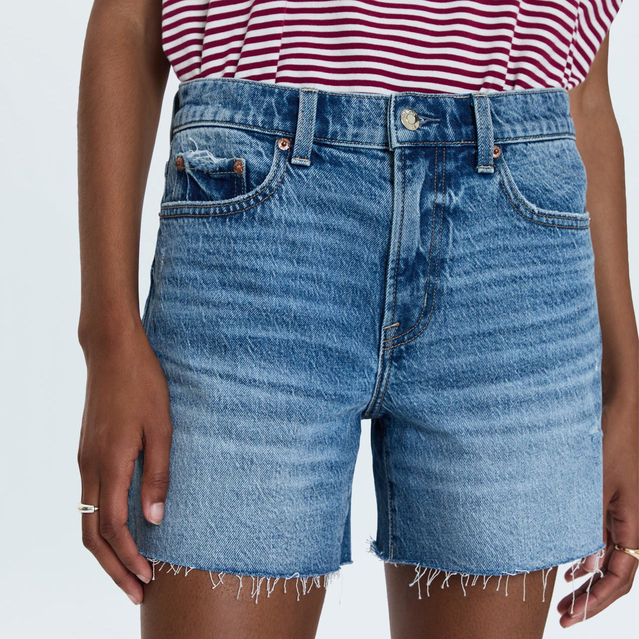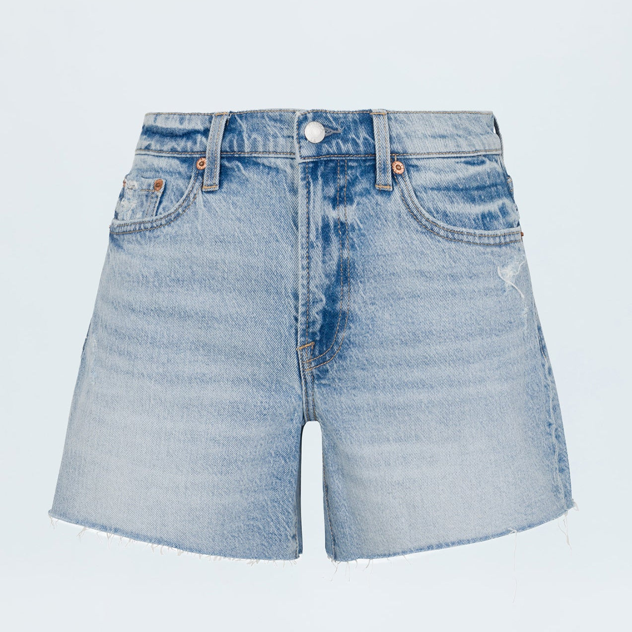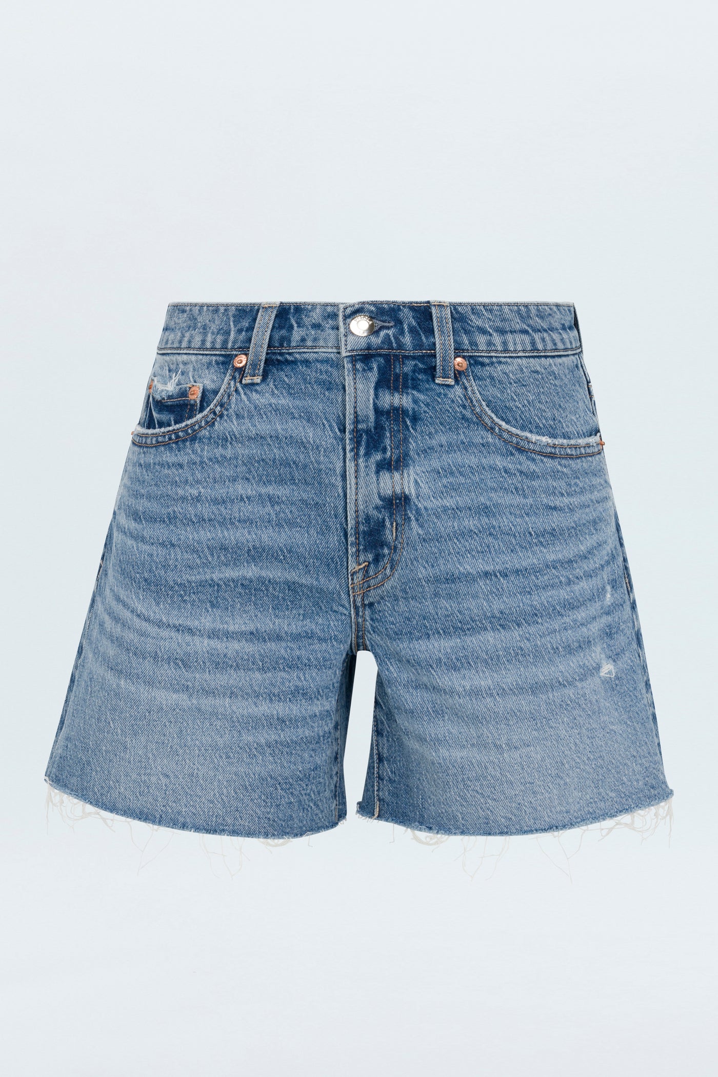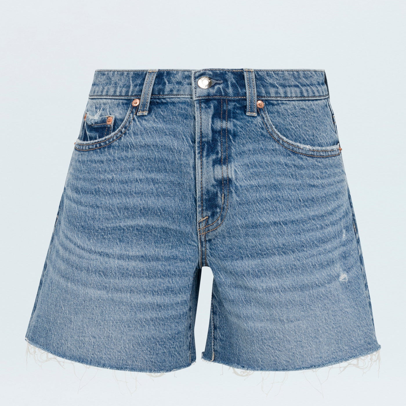 Split the difference. Mid-rise short with a medium length and a relaxed fit makes Kennedy a real crowd pleaser. Crafted from our signature comfort stretch denim, Normandy Vintage is an ultra light denim wash with blasted fading, whiskering and a raw scissor cut hem.