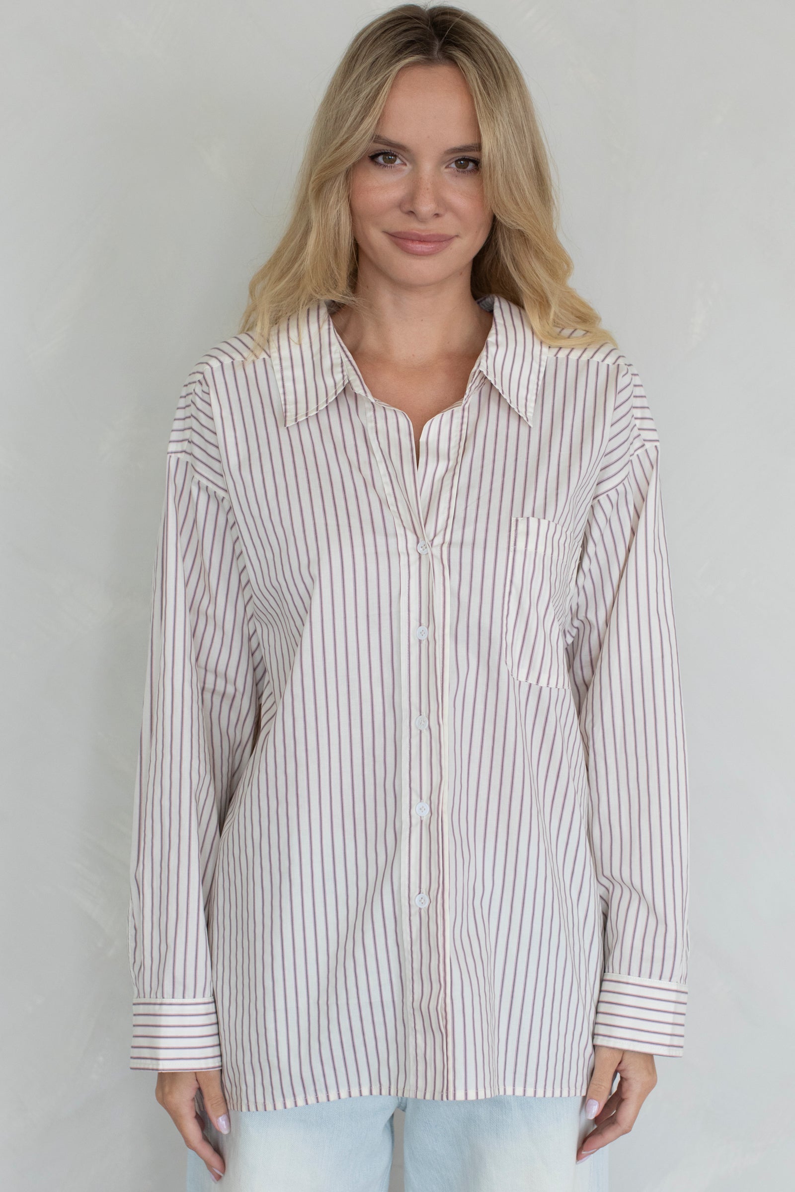 Throw on the Emily Blouse and embrace that effortlessly cool vibe. This perfectly oversized button-down features charming mini vertical stripes that add just the right amount of visual interest without trying too hard. Layer it, tie it, or wear it solo—it's the kind of piece that works with everything and makes getting dressed actually fun. Pure wardrobe magic.