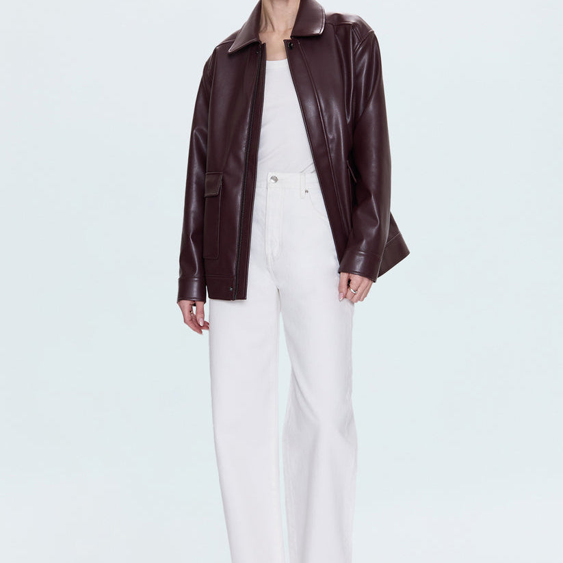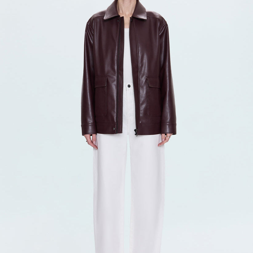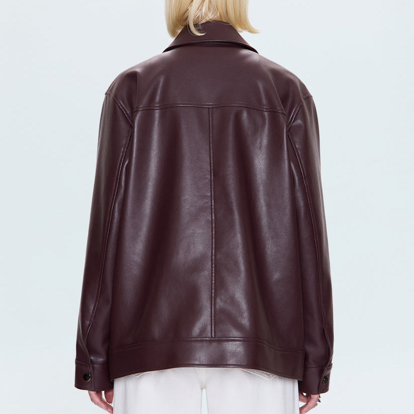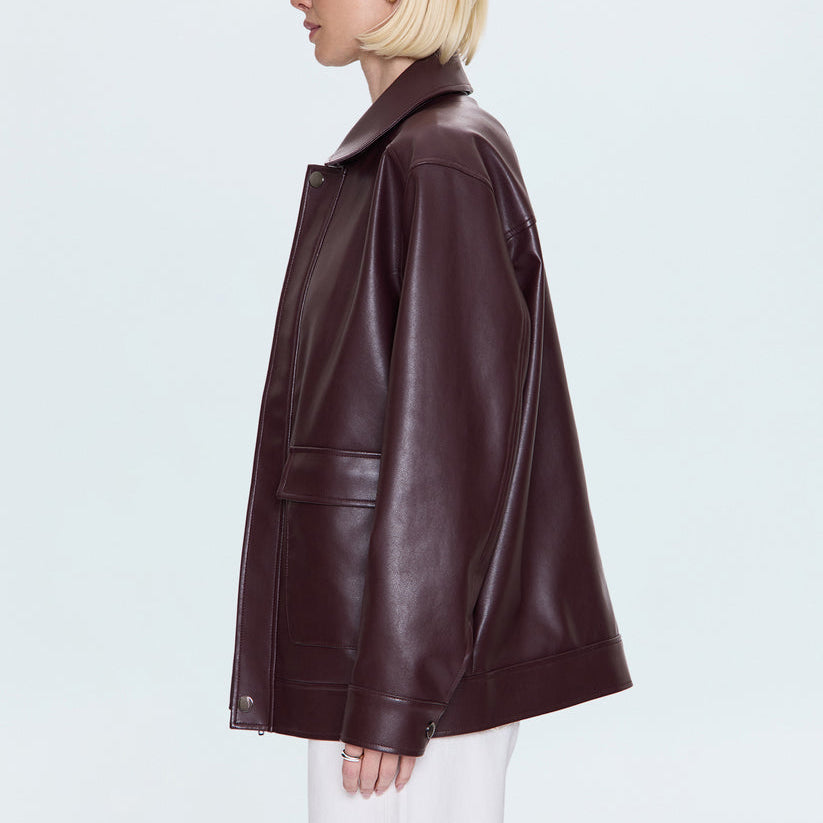 The bomber that brings sophisticated edge. Valerie delivers modern luxury with a classic bomber silhouette and premium alternative leather construction that feels authentically rich. The relaxed fit creates effortless cool while the zip-front closure and ribbed details add traditional bomber appeal with contemporary refinement. Crafted from 100% polyurethane with polyester backing that provides structure and durability without compromising comfort. Cabernet brings deep sophistication with its rich burgundy tone.