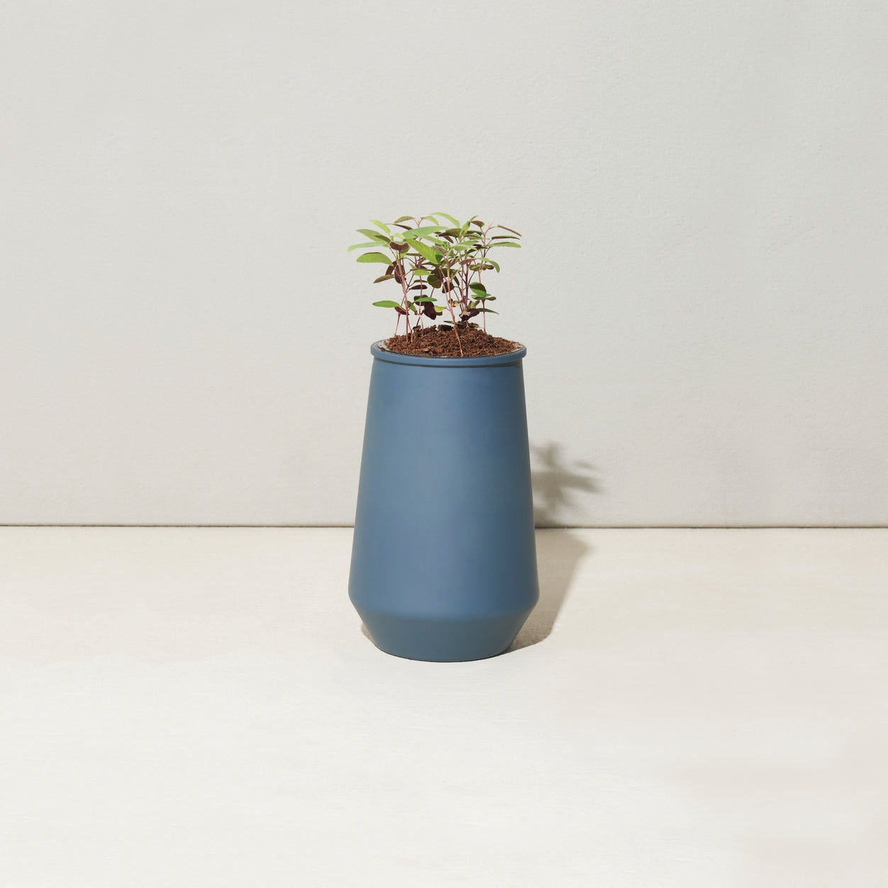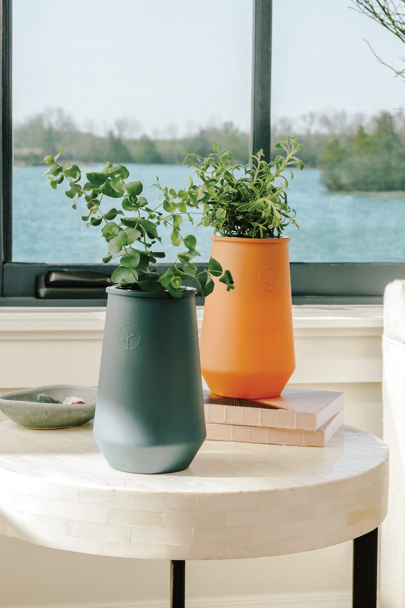 An indoor grow kit featuring a self-watering system that is outfitted in an opaque glass planter — just add water and set in a sunny window.