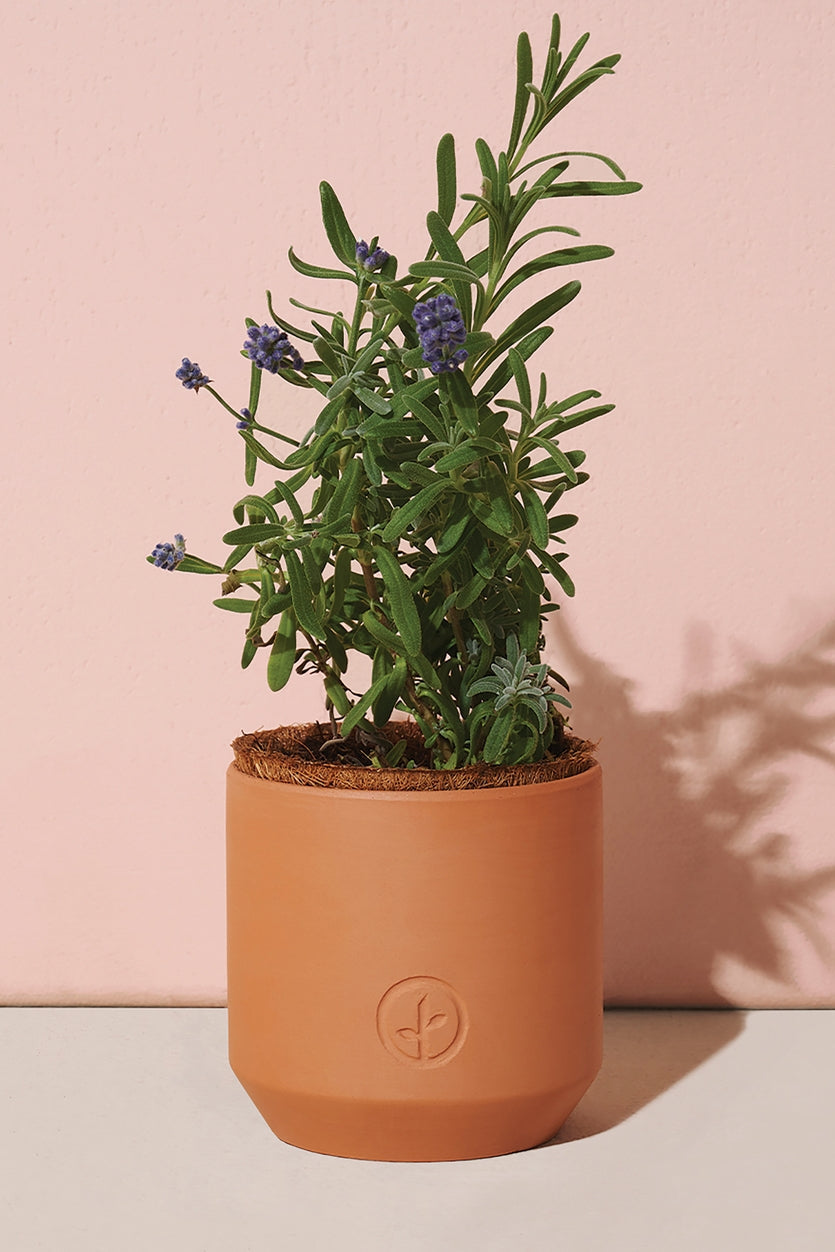 Features a terracotta planter with a water-tight glazed interior and a nested coconut pot to provide drainage. As the plant matures, the coconut pot can be transplanted into a larger pot or garden.