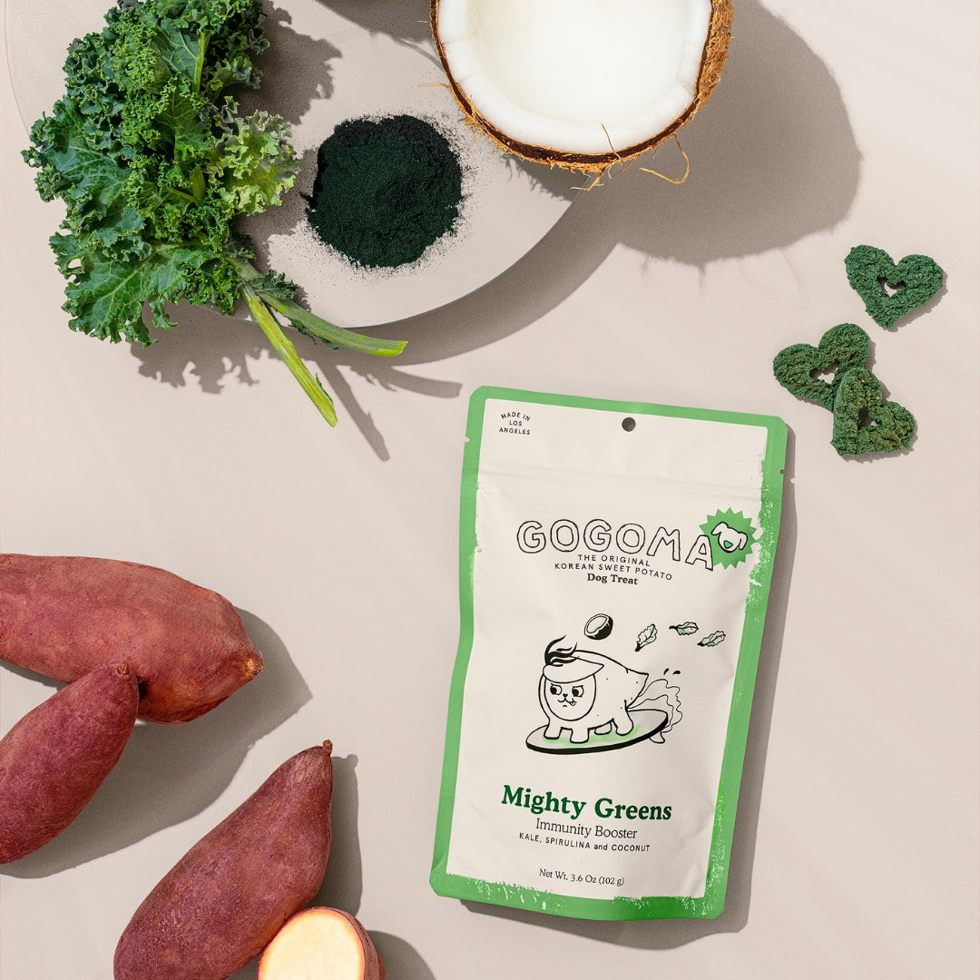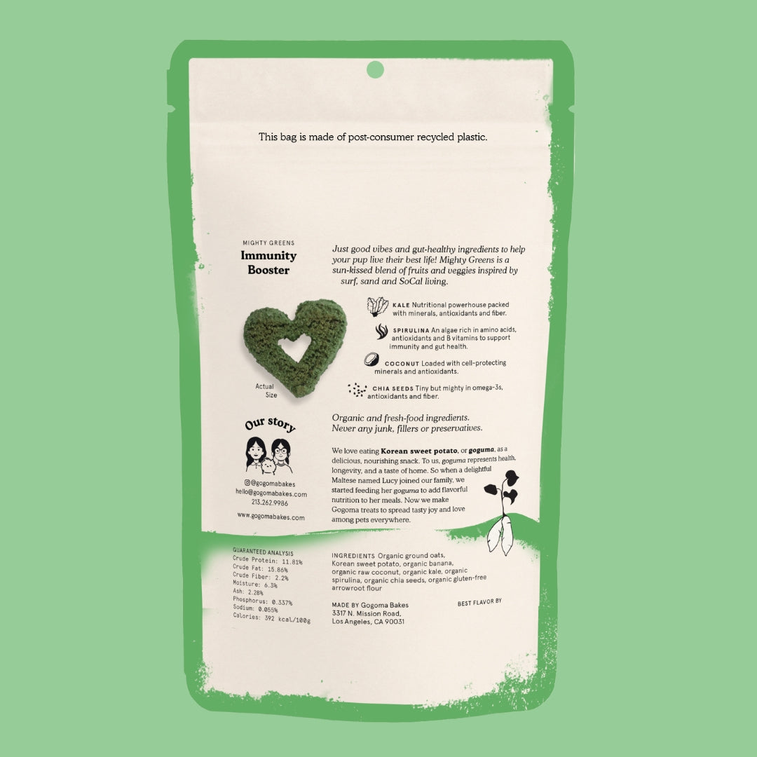 Boost your pup's gut health with Mighty Greens, our SoCal-inspired dog treat packed with spirulina, coconut, kale, and Korean sweet potato. Ideal for picky eaters, these crunchy treats offer omega-3s, B vitamins, and antioxidants for immunity and overall wellness. Use for training, daily treats, or meal enhancers!