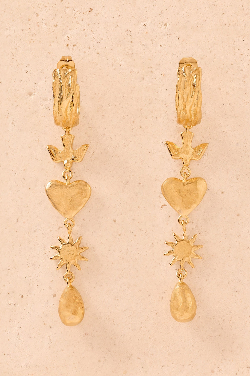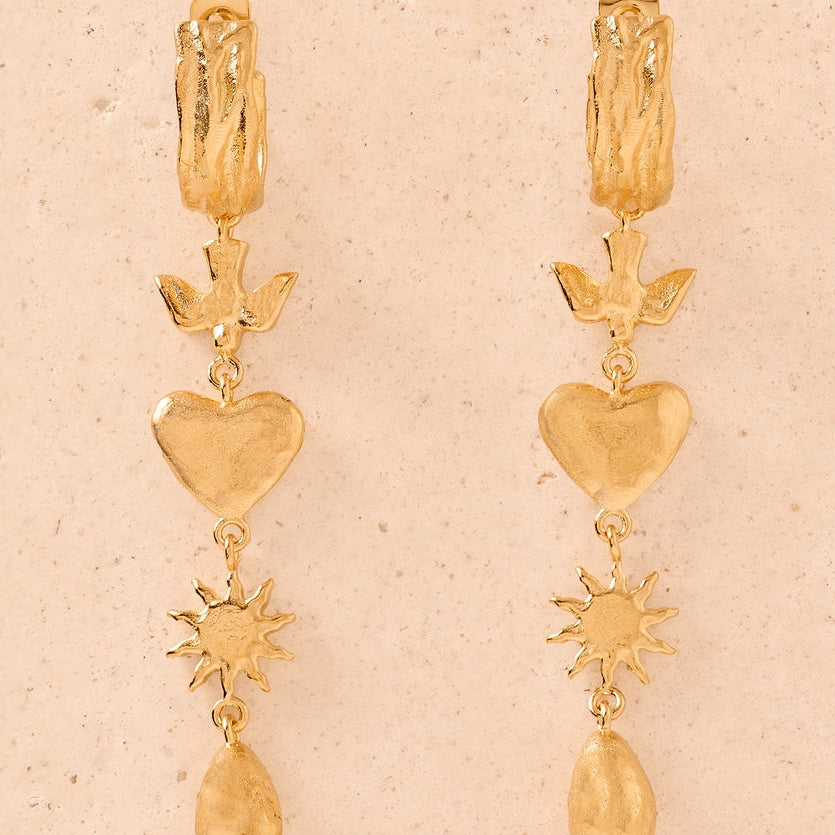 An ode to life’s magic and precious moments: a dove for peace, a heart for love, a sun and a drop for nature’s wonders. Discover the secrets to happiness with our Amara pendant earrings.