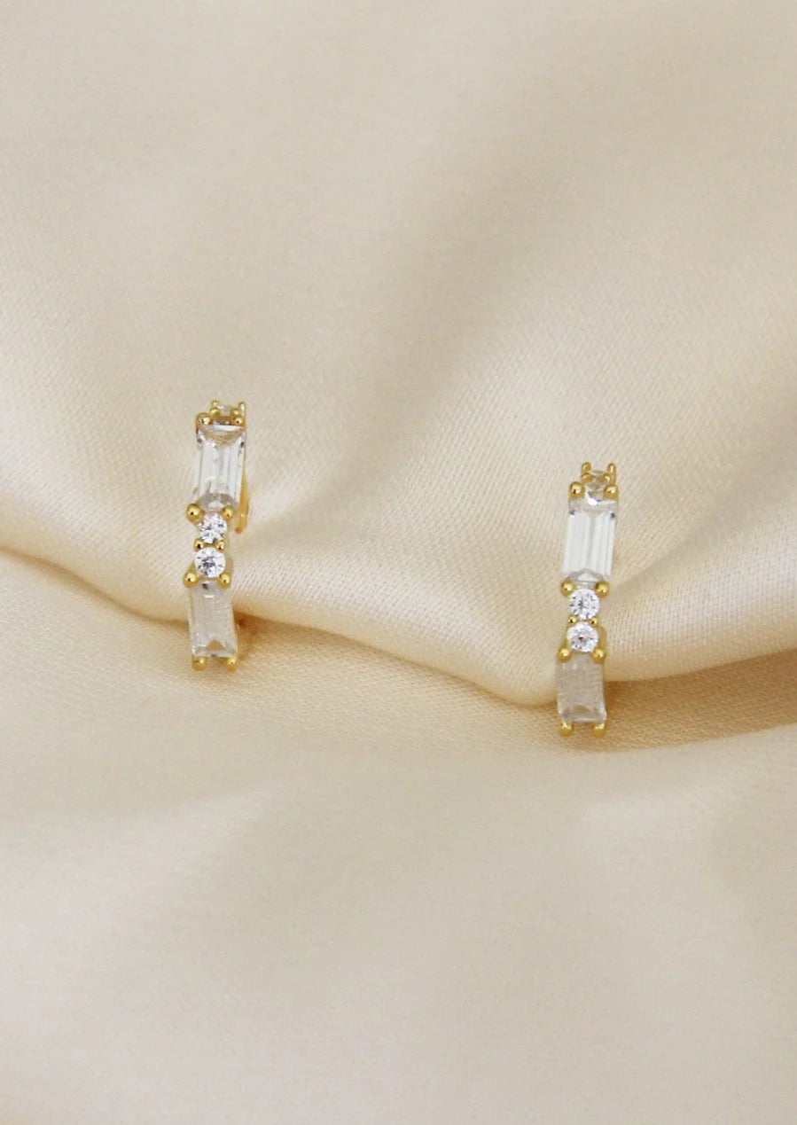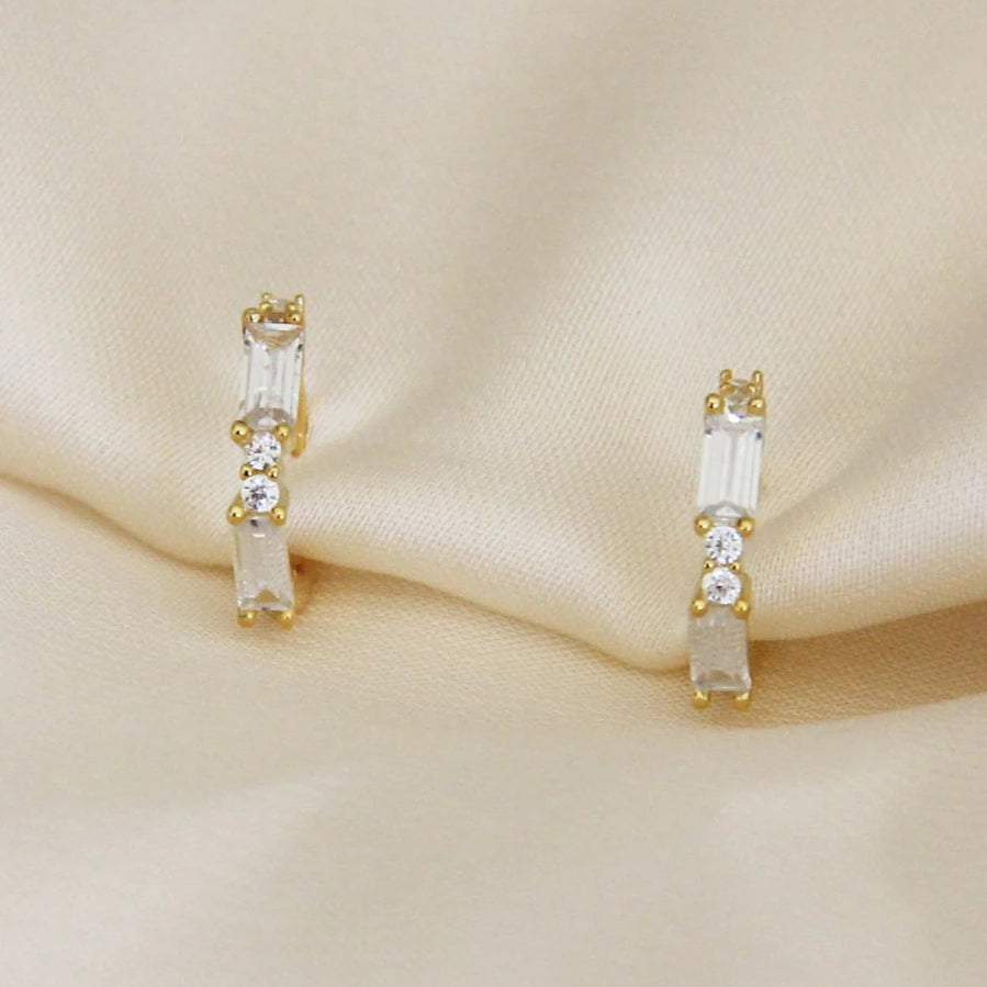 Ethereal CZ Hinged Hoop Huggies. Featuring dainty hinged hoops with baguette and round CZ detail. Perfect for every day and layering.