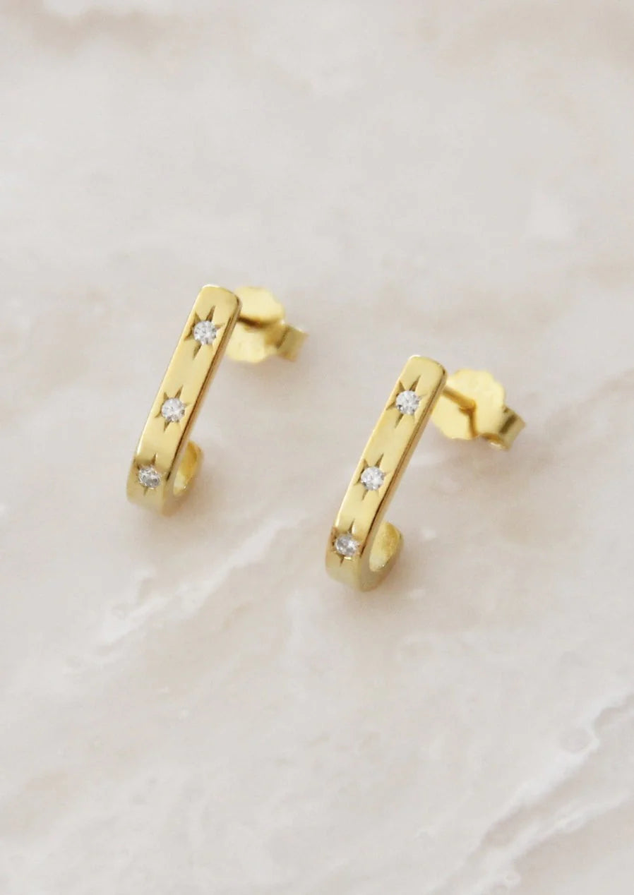Etched Starlight CZ Semi Hoop Earrings. Featuring cubic stones. Perfect for a subtle sparkle worn alone or great layered with other pieces. Showed styled with other pieces from our shop. Image is a close up for detail. Please refer to our measurement and model photo for sizing/scale.