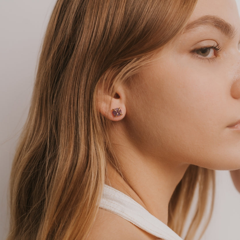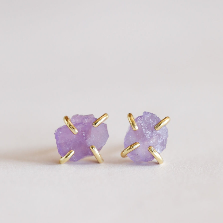 Hand-cut raw stones vary in shape and size. Each stone is set in a 4-prong claw setting. Amethyst stones are known as the healing stone. Tarnish Free - Long lasting protective coating safeguarding your jewelry from sweat, water, and more. Sterling Silver – Gold plating over silver Hypoallergenic – Lead Free