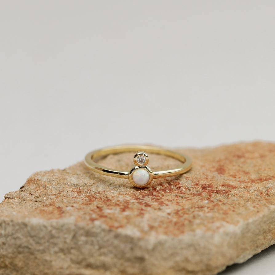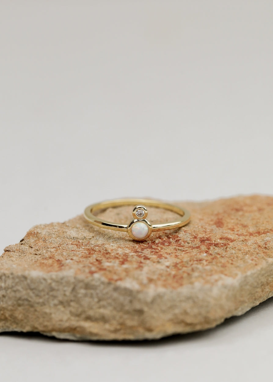 A crisp white CZ stone offsets a white opal creating an everlasting infinity swoop, reminding us of balance, focus, and that our possibilities are limitlessness. White opals open and strengthen the crown chakra, bringing about optimism, grace, and love to the wearer. We crafted our collection of rings to make every day a reminder of joy, self-love, and to shine from within. Tarnish Free - Long lasting protective coating safeguarding your jewelry from sweat, water, and more. 5x more gold that standard 18k gold plating over brass Hypoallergenic – Lead Free Synthetic white opal gemstone Band width approx. 1mm Stone setting approx. 4mm Sizes 6, 7, 8