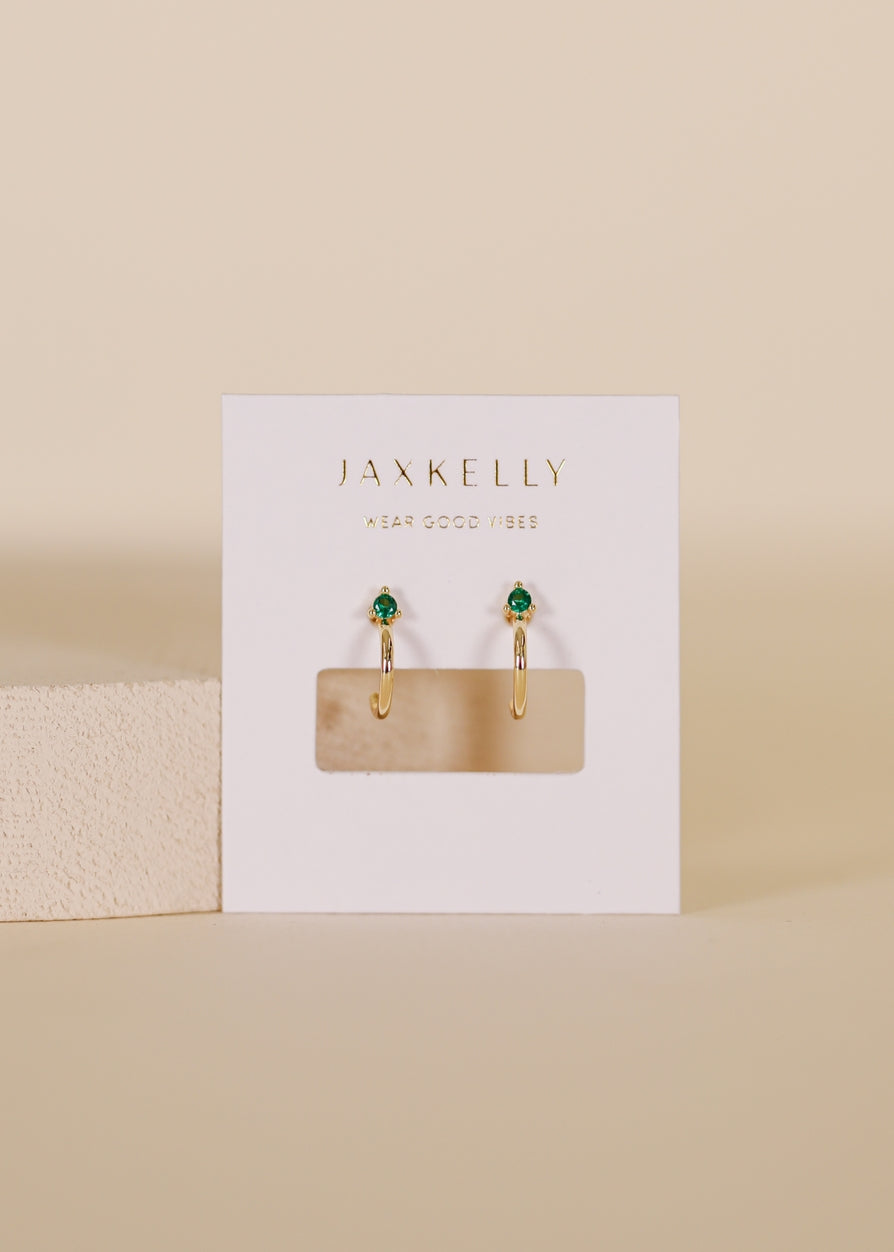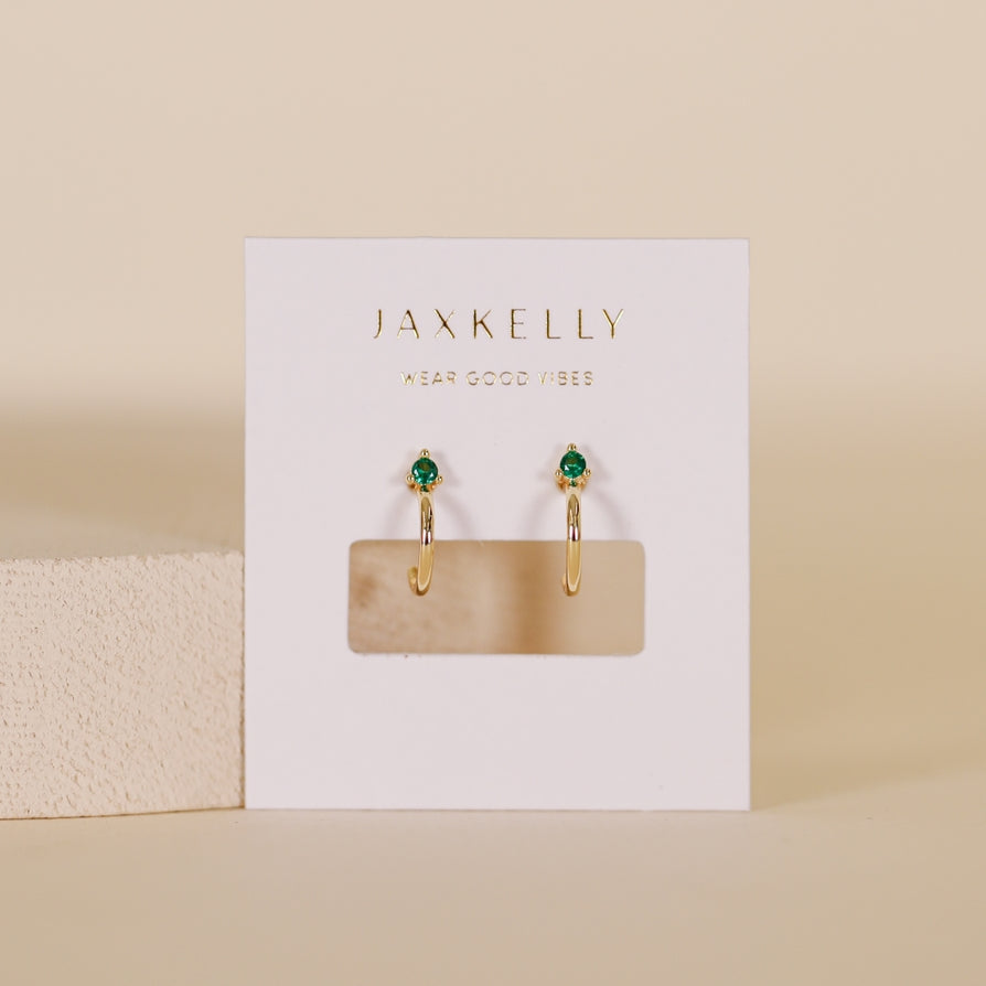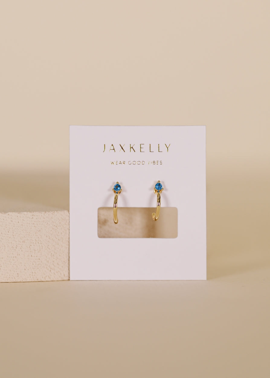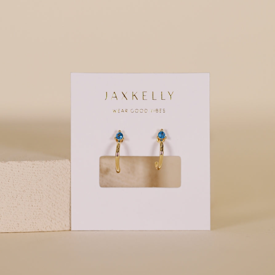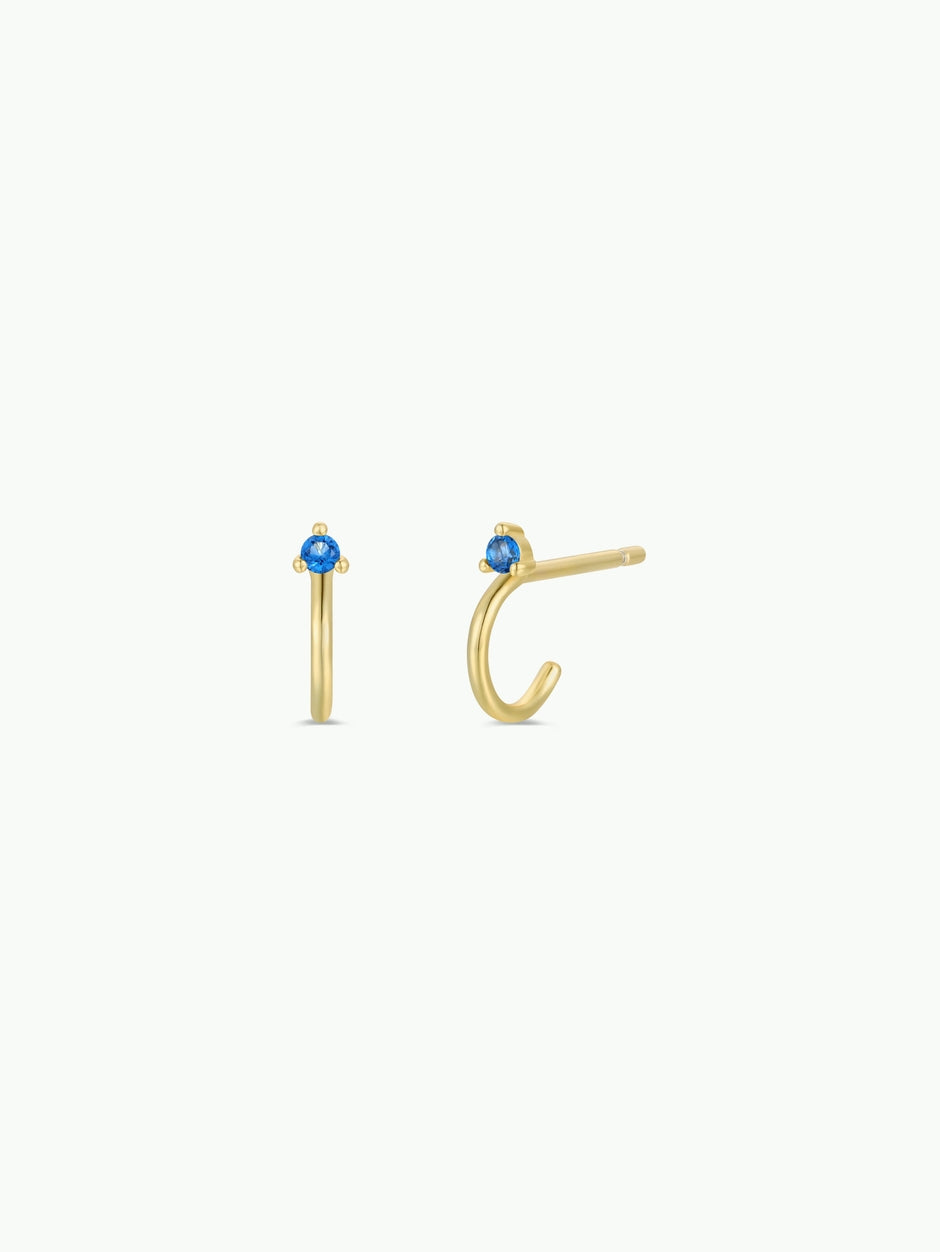 Our smallest hoop earring features a straight-back post with a mini cz that adds a pop of color. The hoop hugs the ear and can be worn anywhere. Tarnish Free - Long lasting protective coating safeguarding your jewelry from sweat, water, and more. Sterling Silver Posts – 18K gold plating over brass Hypoallergenic – Lead Free 2mm sapphire CZ stone 7mm hoop opening