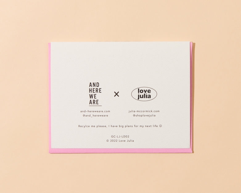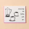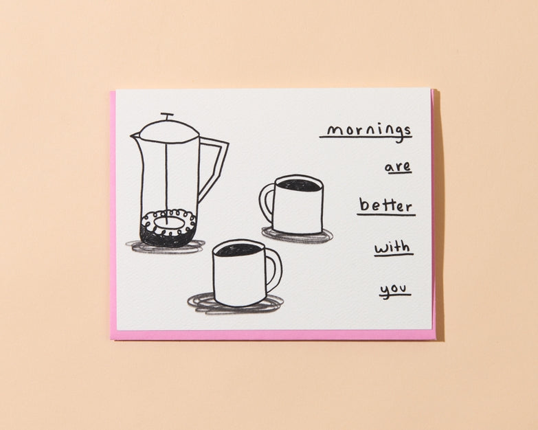 Take care of yourself. This sweetly hand drawn cup of tea will brighten their day. • Card reads, "Mornings are better with you" • Digitally printed onto luxe, bright-white linen textured paper • Folded card measures A2 (4.25″ x 5.5″) and comes with a coordinating envelope • Made in the US • Words and illustrations by Julia McCormick. - Love Julia X And Here We Are