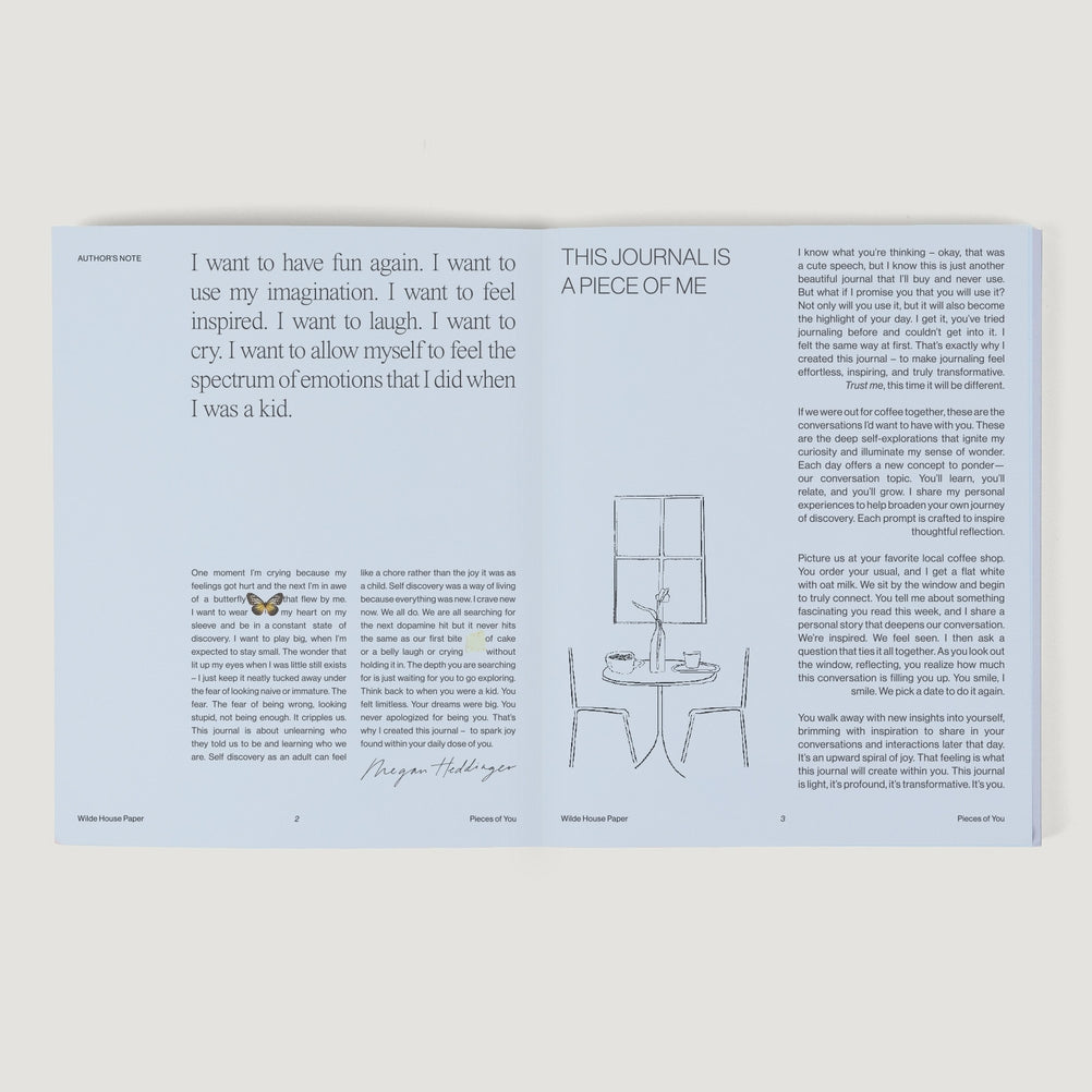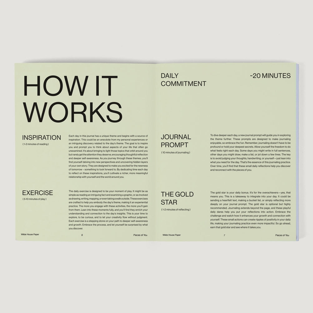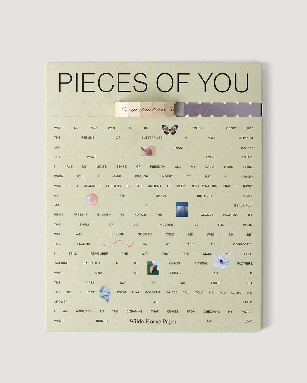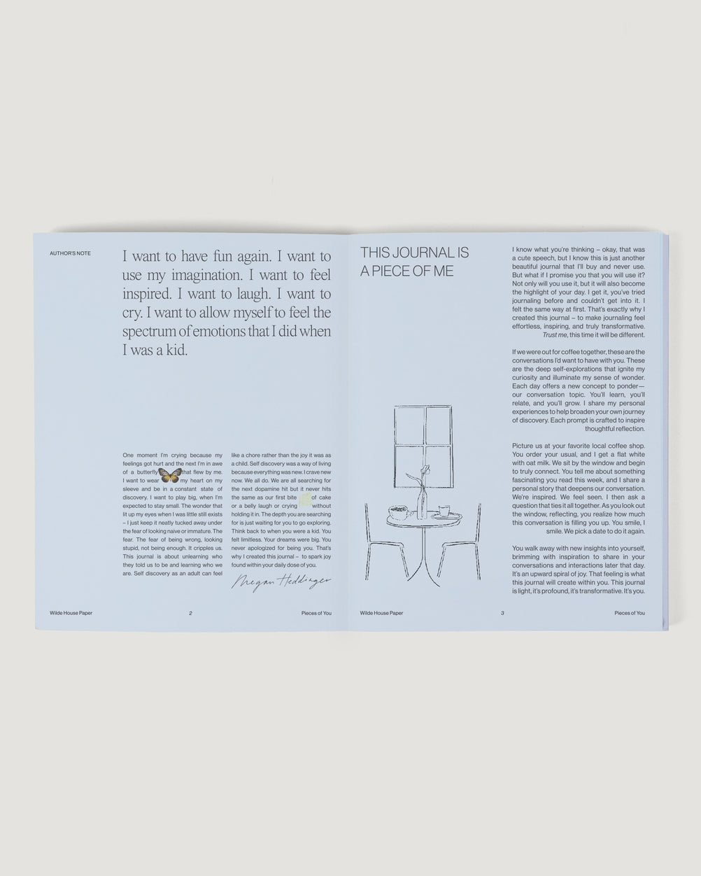 Think back to your childhood, a time when wonder, curiosity, and play were your everyday companions, untouched by the world's influences. The Pieces of You Journal is your invitation to reconnect with that pure, childlike state of mind. Journaling doesn’t have to be intimidating. Approach each day with the same openness you felt as a child, and rediscover the pieces of you that you lost along the way of growing up.