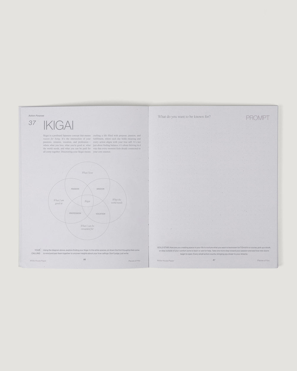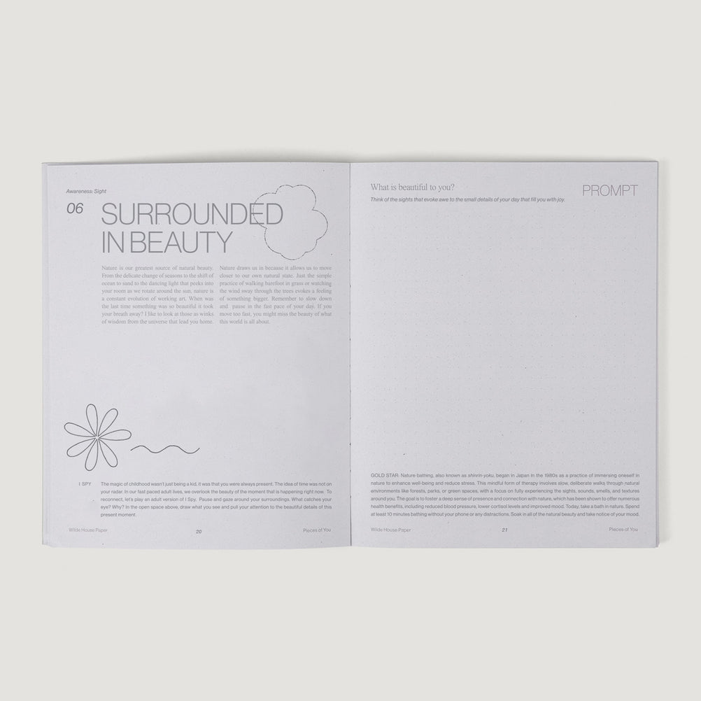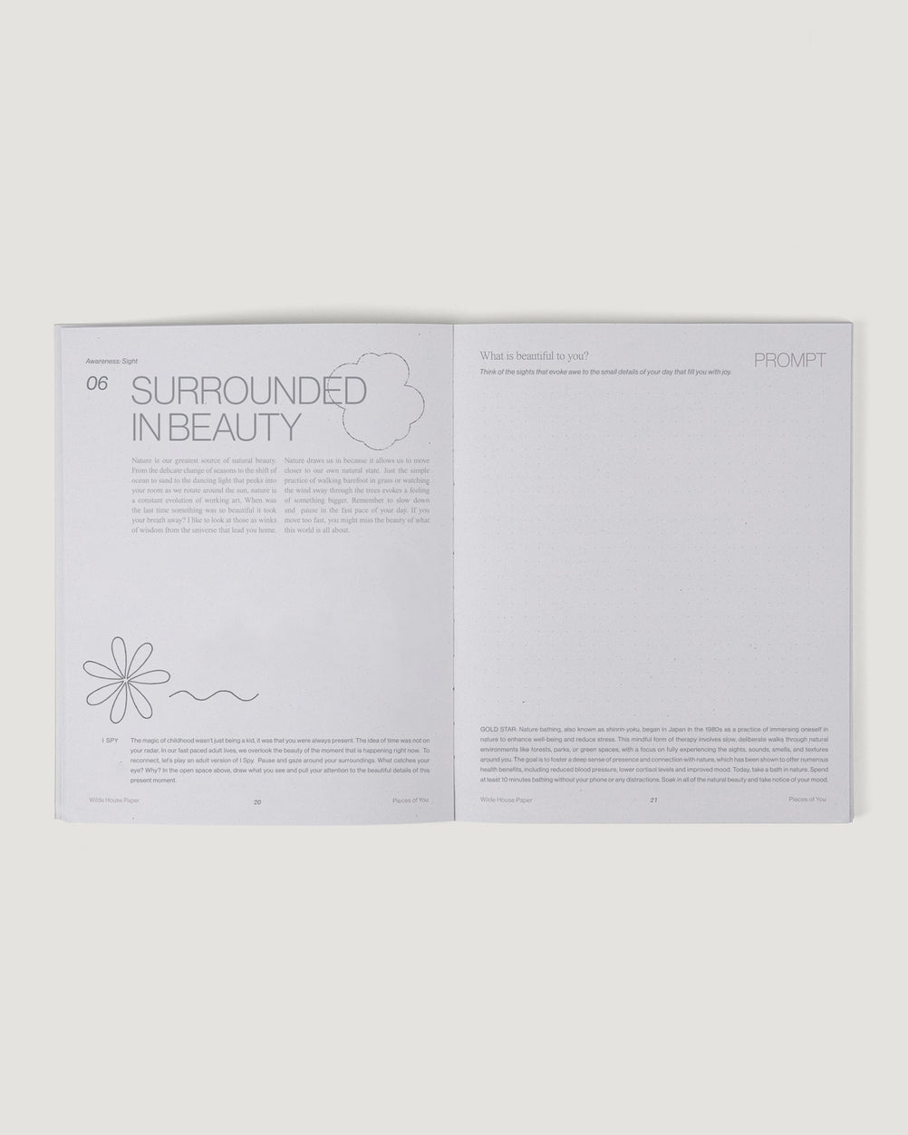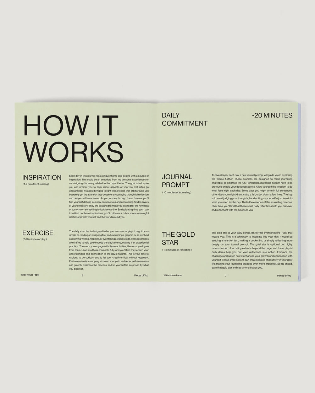 – Each day is guided by a reimagined childhood theme that includes inspiration, an interactive exercise, a journal prompt, and gold star activity to take into your day.