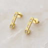 Etched Starlight CZ Semi Hoop Earrings. Featuring cubic stones. Perfect for a subtle sparkle worn alone or great layered with other pieces. Showed styled with other pieces from our shop. Image is a close up for detail. Please refer to our measurement and model photo for sizing/scale.