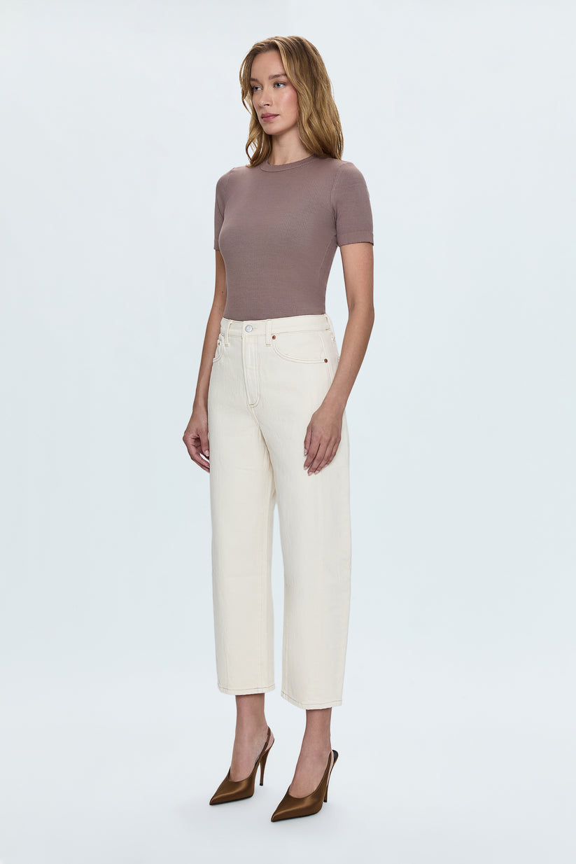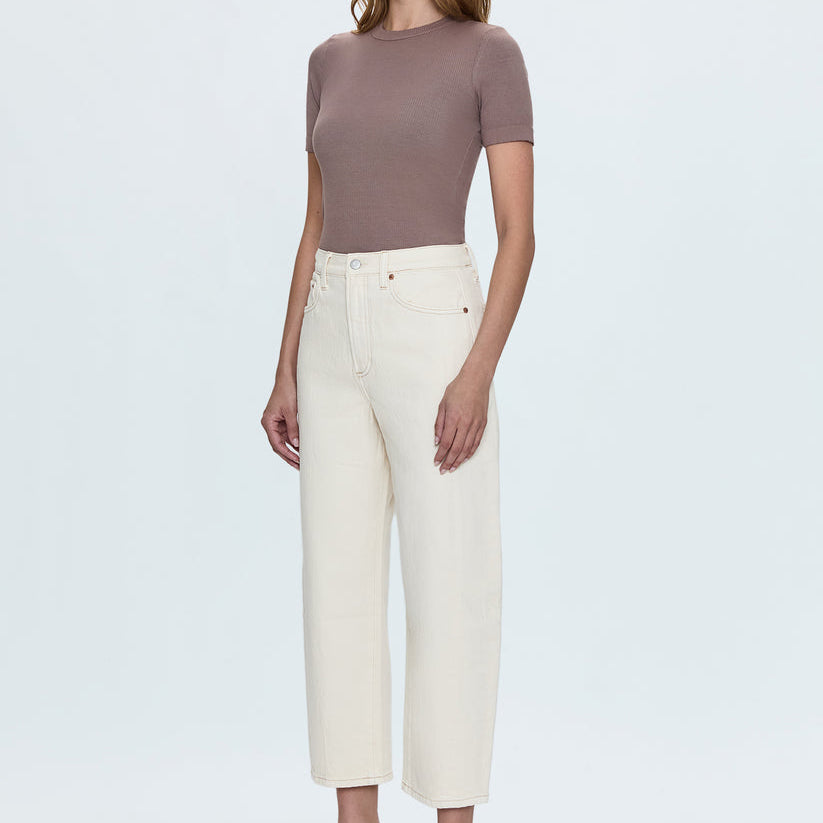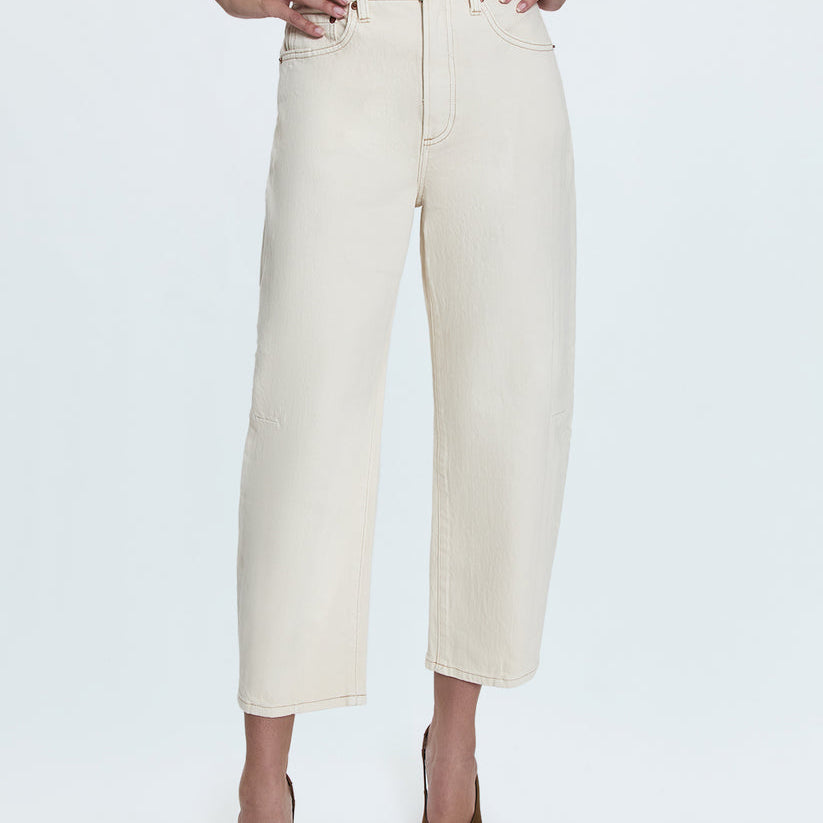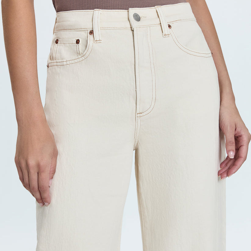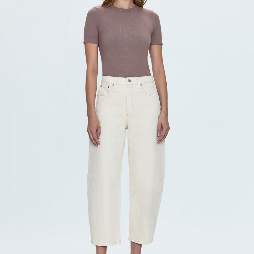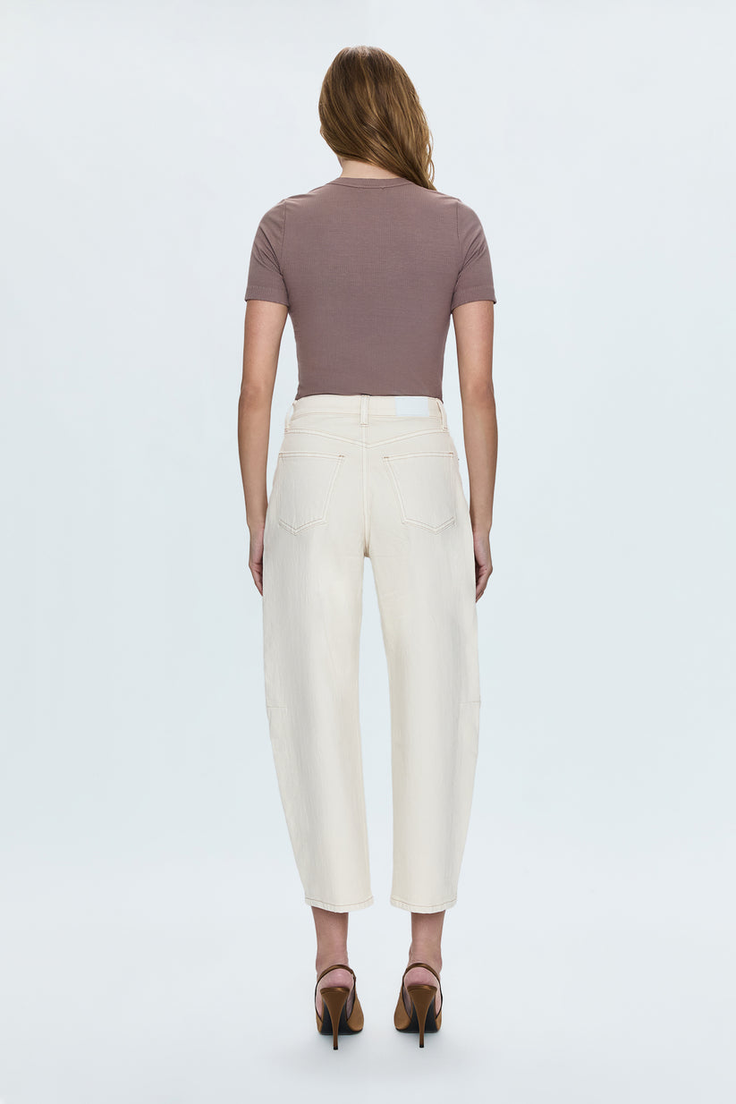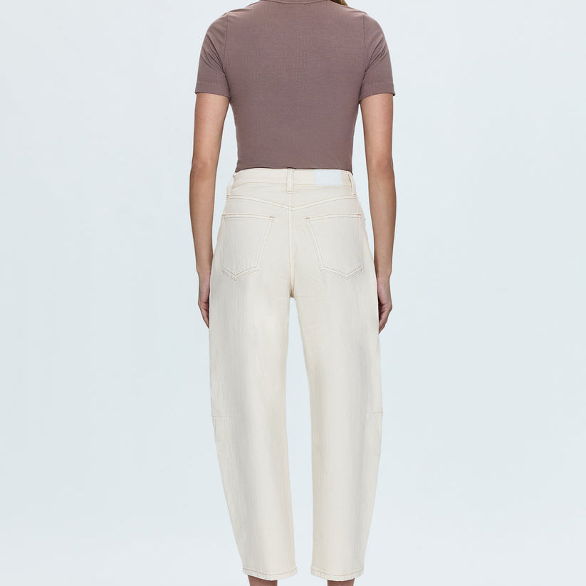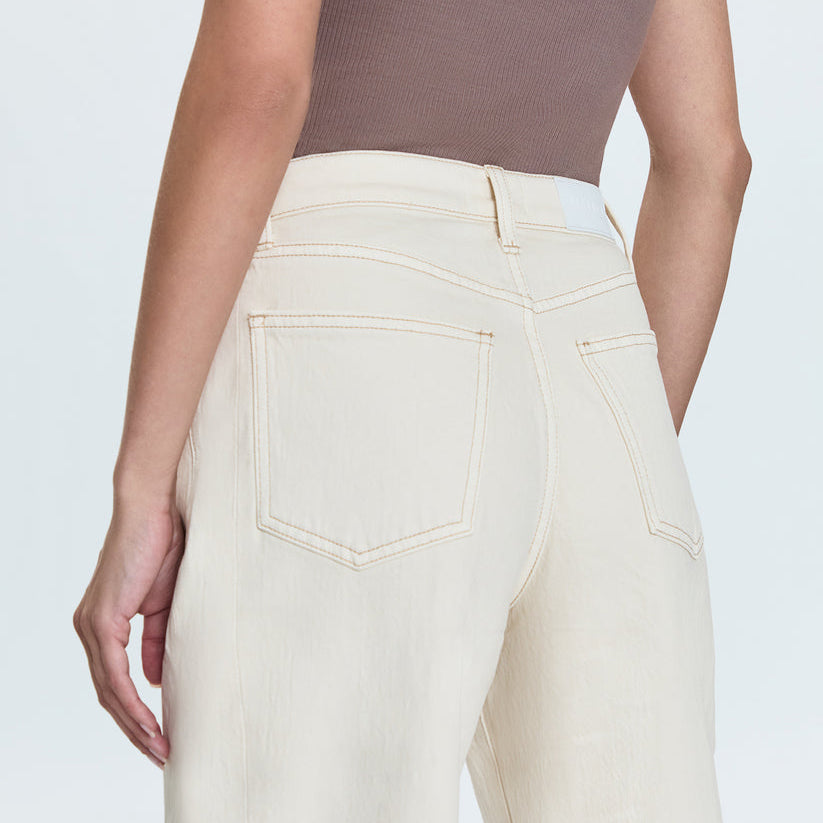 A modern silhouette designed with a barrel bowed leg and a relaxed silhouette with a 26" inseam. Crafted from our wear-everywhere comfort stretch denim. Offered in a warm, off-white colored denim wash with contrast stitching and contrast metallic hardware.