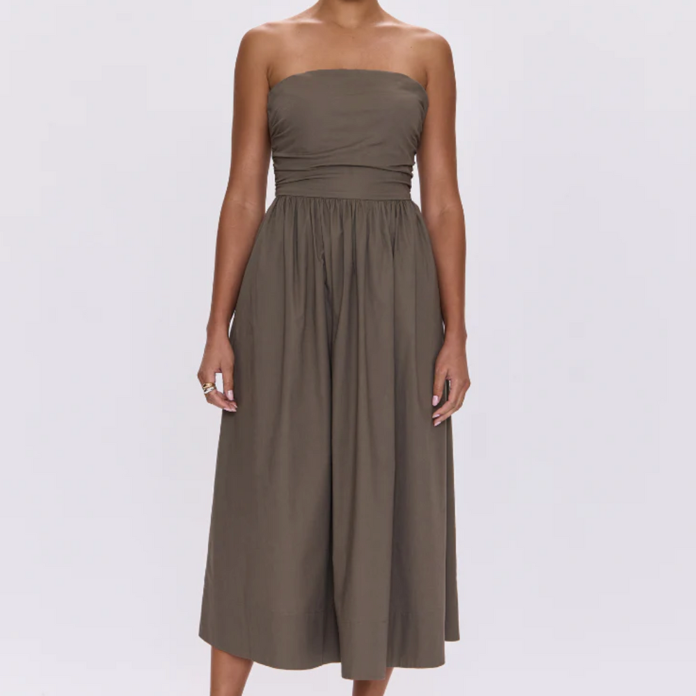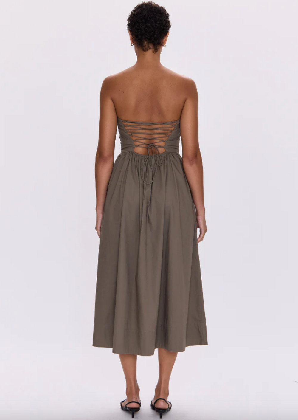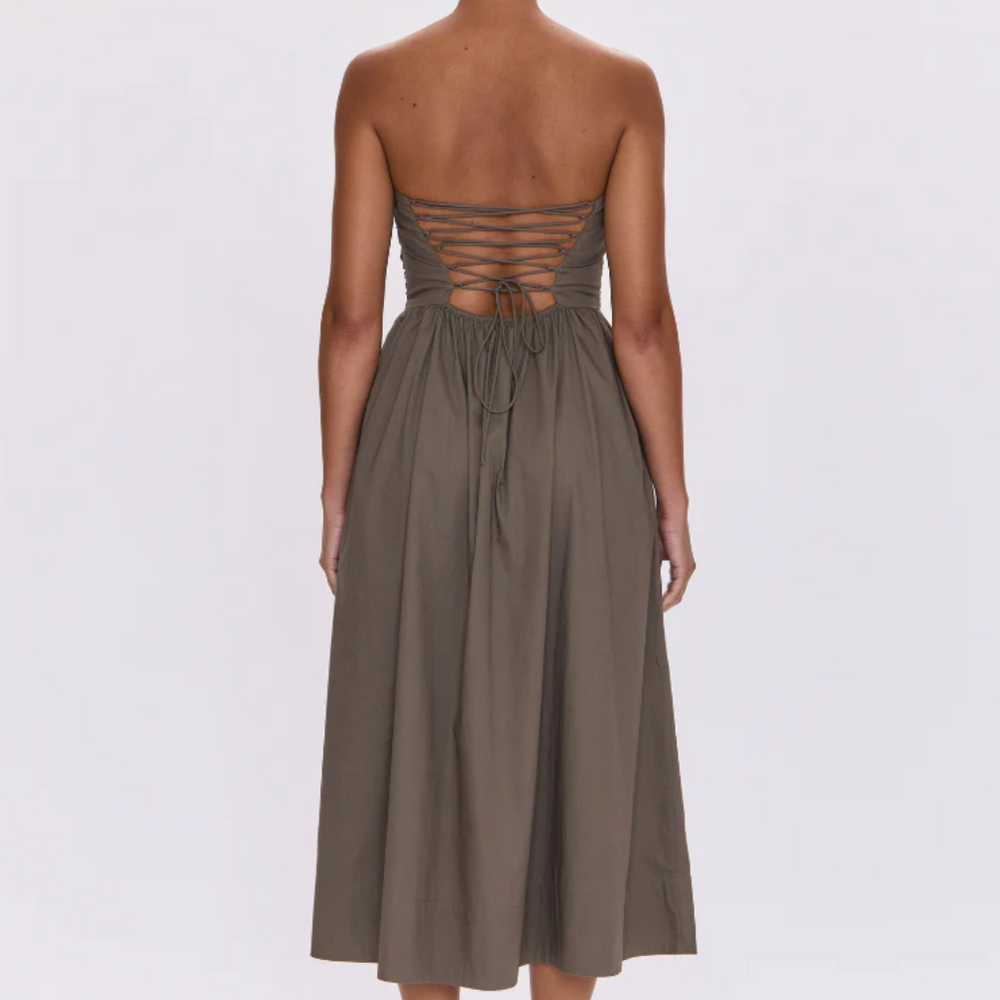 The Florence Midi Dress combines a flirty ruched bodice with a delightfully full skirt, all crafted from soft, stretch-kissed cotton for easy movement. The lace-up back adds a playful touch and lets you customize the fit perfectly. It’s the ideal dress for twirling through any occasion with effortless charm.