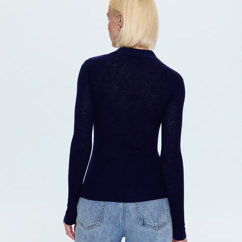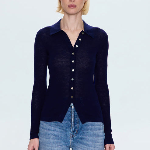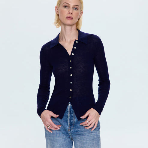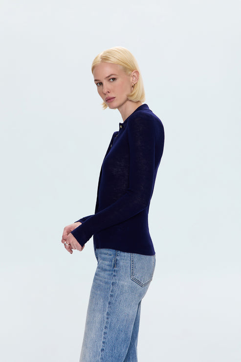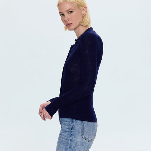 The cardigan that knows its place in your rotation. Korey delivers fitted sophistication with a ribbed texture and button-front styling that feels both classic and contemporary. The tailored silhouette creates flattering lines while the splayed hem adds subtle movement and modern appeal. Crafted from luxurious merino wool that feels soft against the skin yet holds its expert shape. Navy brings timeless versatility that anchors any look with understated elegance.