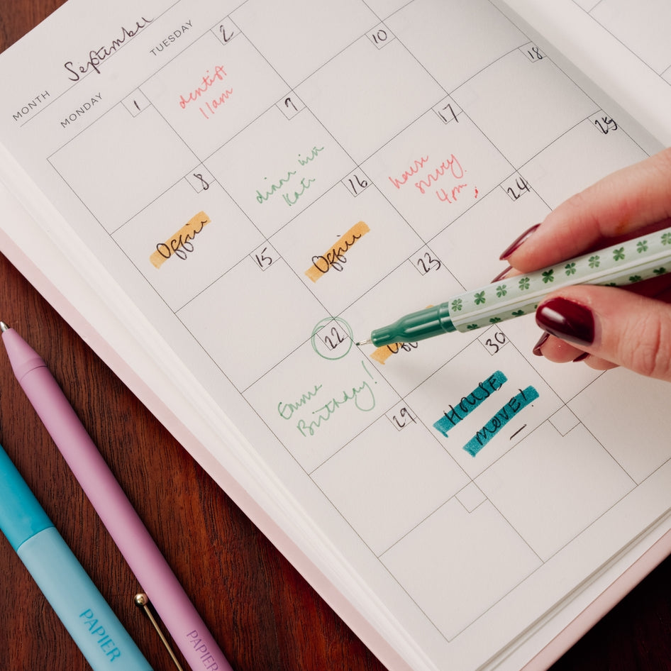 Enhance your stationery collection with Papier's thoughtfully curated pen set, designed by our in-house team. The versatile pack includes two fineliners, two highlighters, and two rollerball pens - perfect for everything from making lists to sketching. Packaged beautifully, this set appeals to a wide range of customers looking for quality writing tools in one convenient package. A must-stock item for retailers looking to offer a premium, all-in-one solution for their customers.