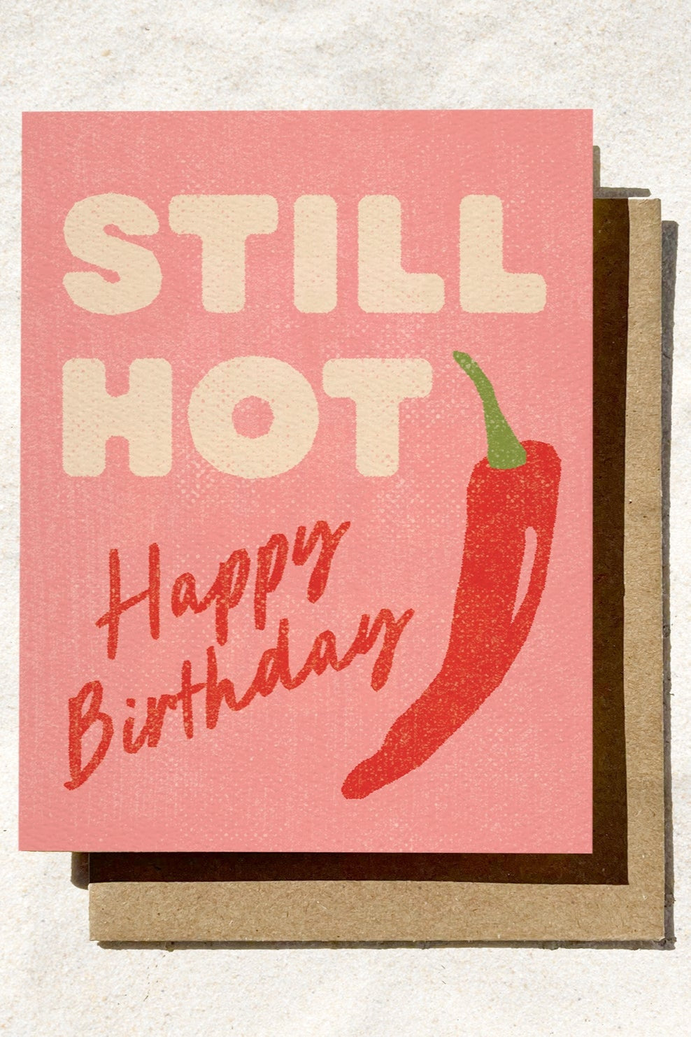 Turn up the heat with this Funny Birthday Card featuring a fiery red chili pepper and bold retro text that says it all: Still Hot. Perfect for flirty birthdays, cheeky besties, or anyone aging like fine hot sauce. A playful, vibrant card that pops on any gift rack.