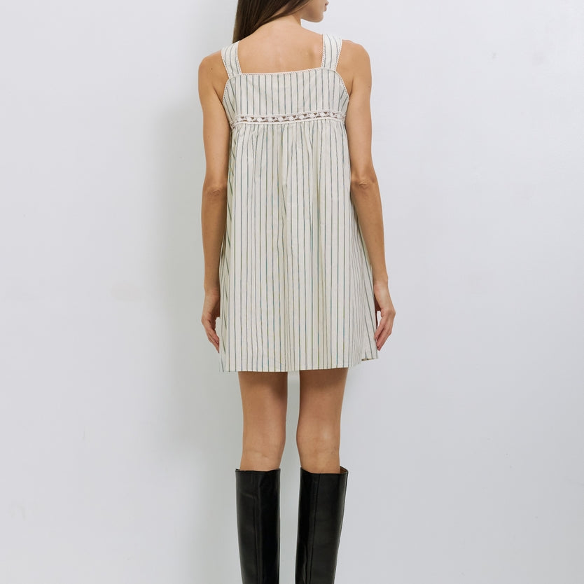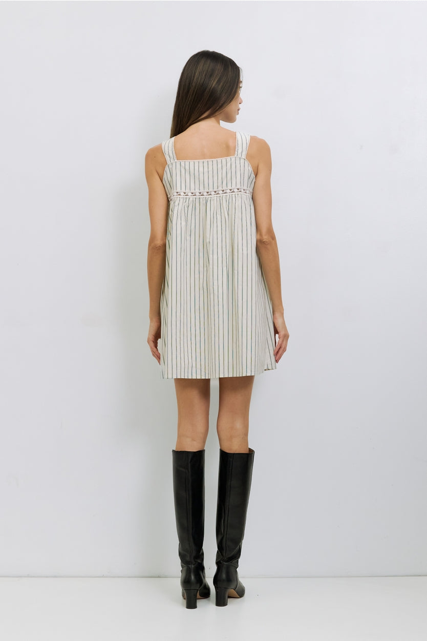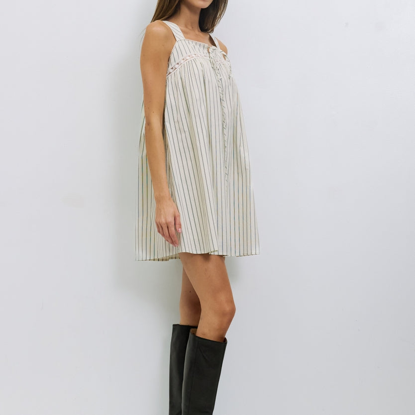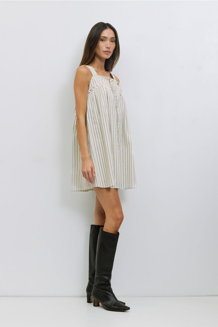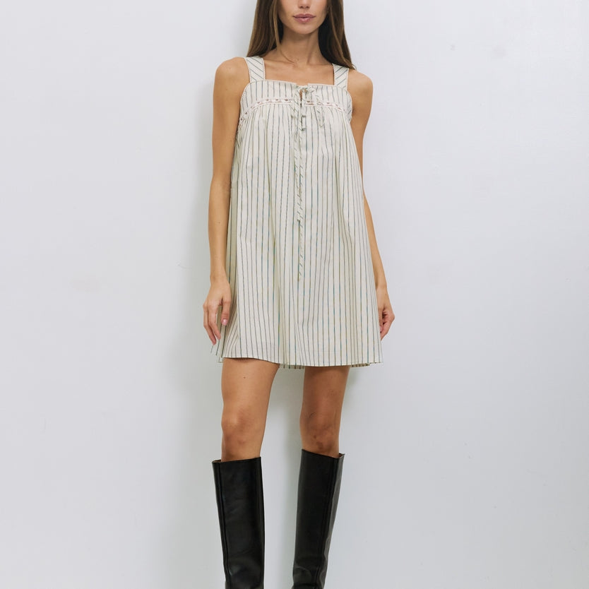 The Harper Dress is made from striped cotton poplin and fully lined. It has a loose, sleeveless babydoll fit with a square neckline, scallop trim along the neckline and straps, bust lace detailing, and a partial front button and tie closure at mini length.