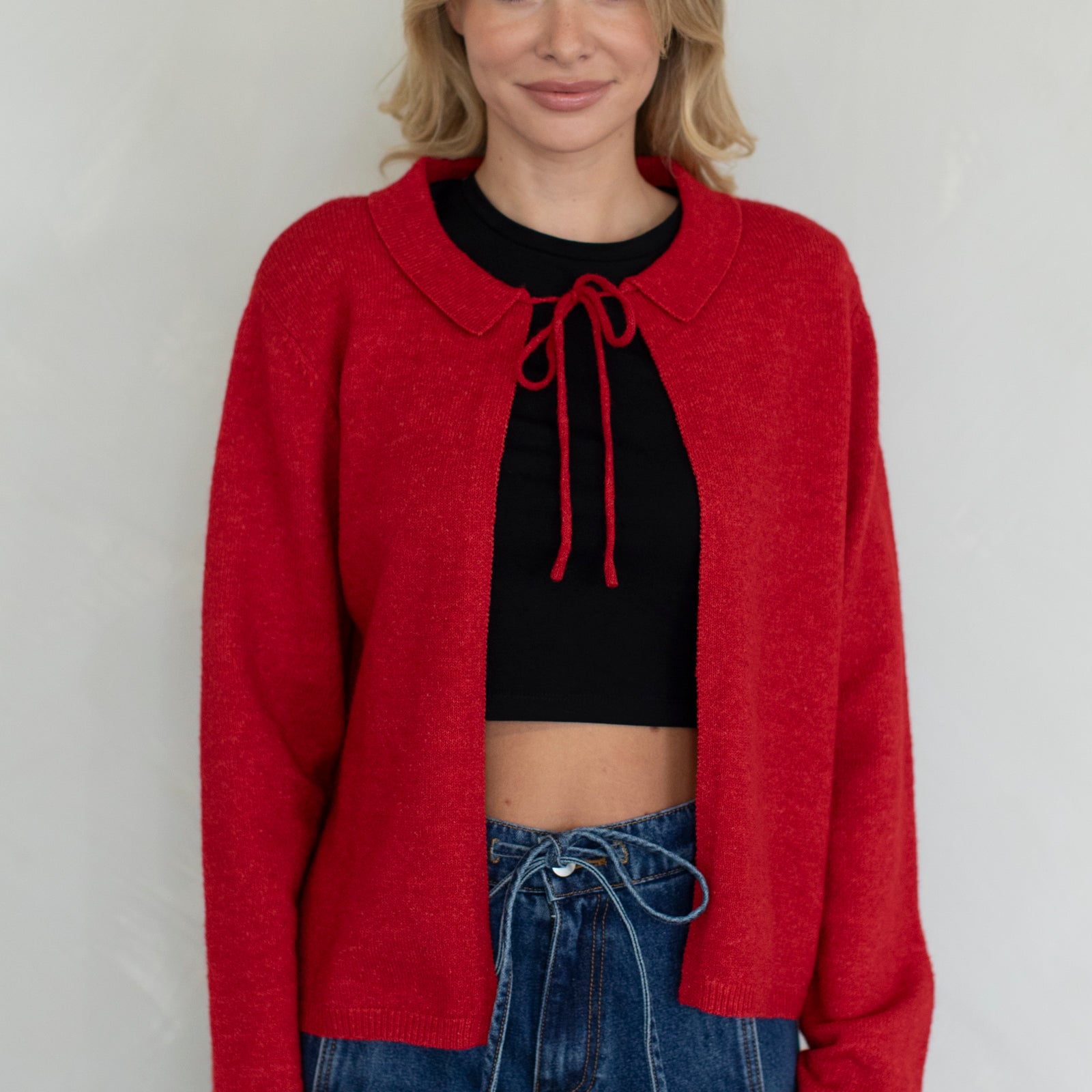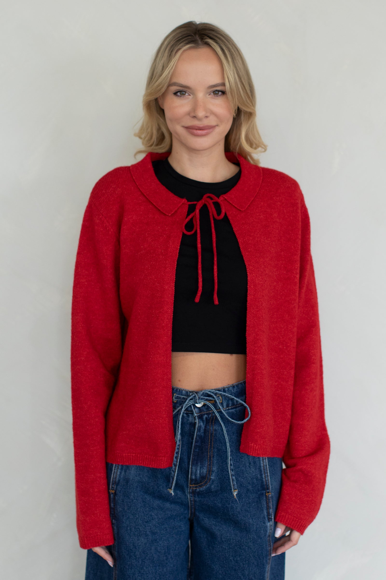 This cherry red Open Bow Cardi is the perfect playful twist on a classic sweater. Featuring a cozy collar and a charming tie at the top, it adds a flirty touch to your everyday look. Soft and vibrant, it’s designed to keep you comfortable while making a fun fashion statement wherever you go.
