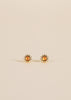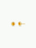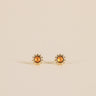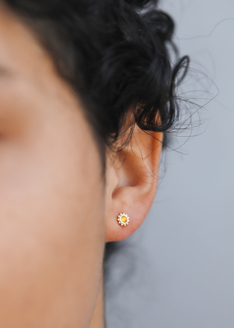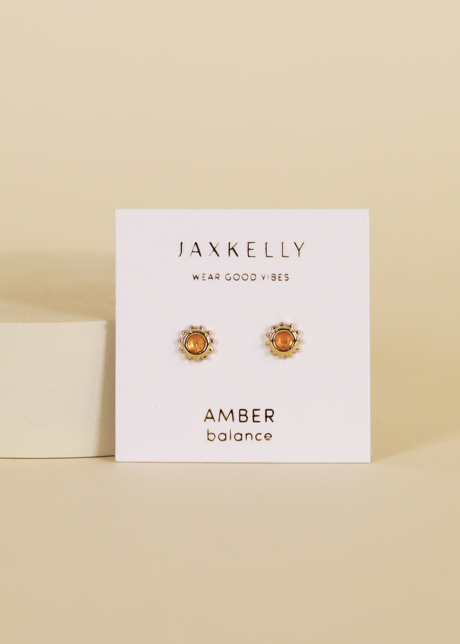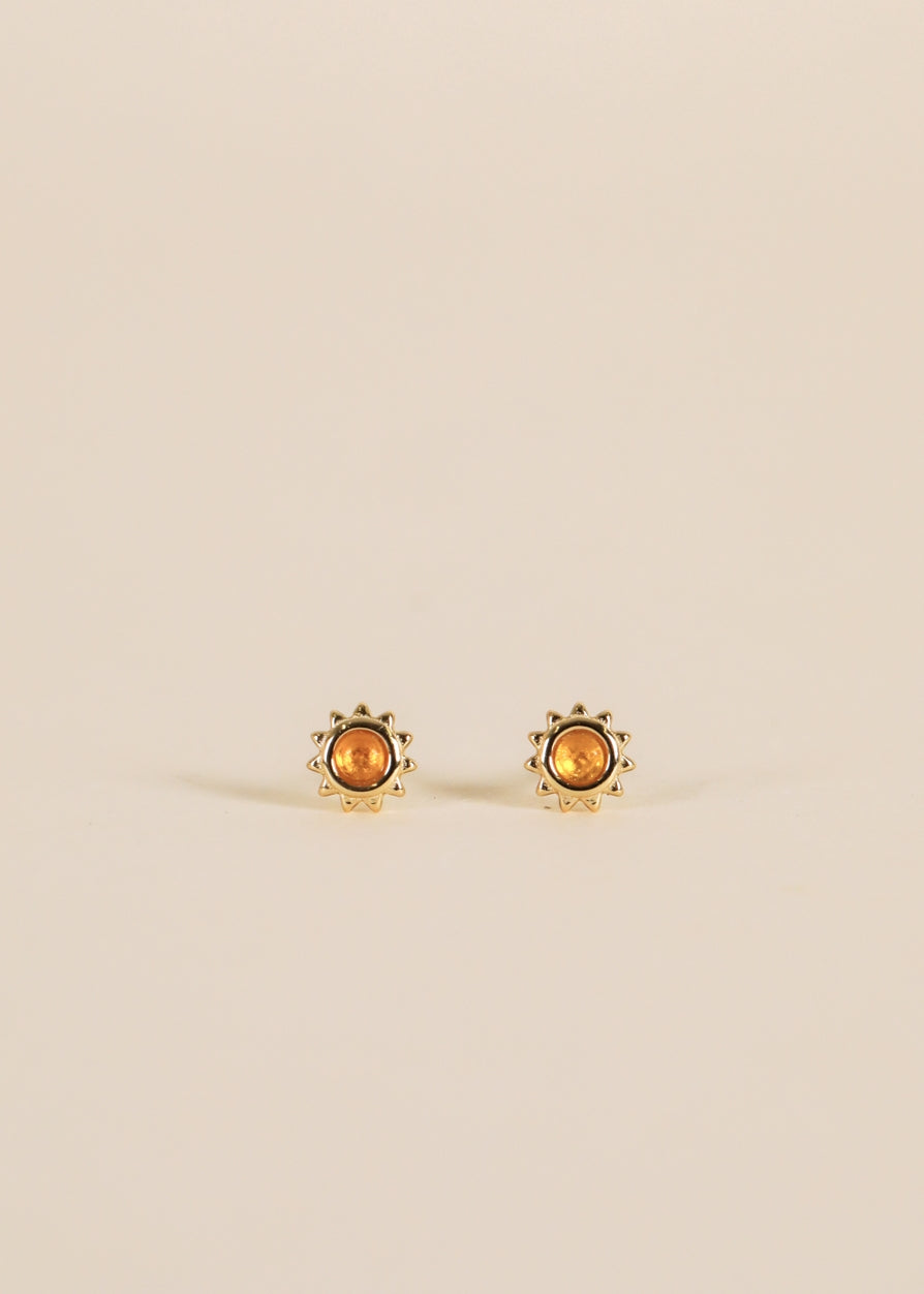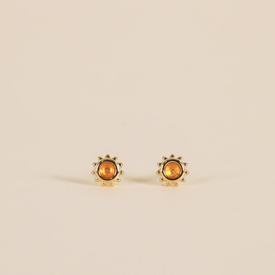 A gold sun featuring a petite polished Amber stone in the center. Tarnish Free - Long lasting protective coating safeguarding your jewelry from sweat, water, and more.