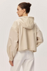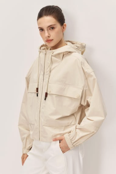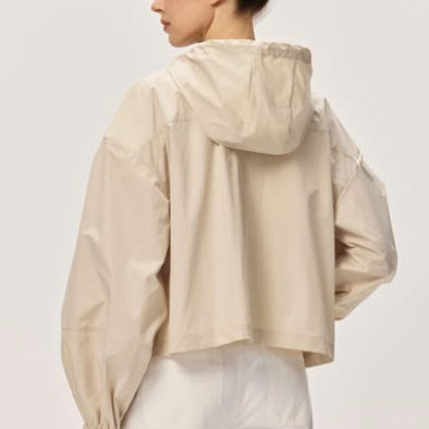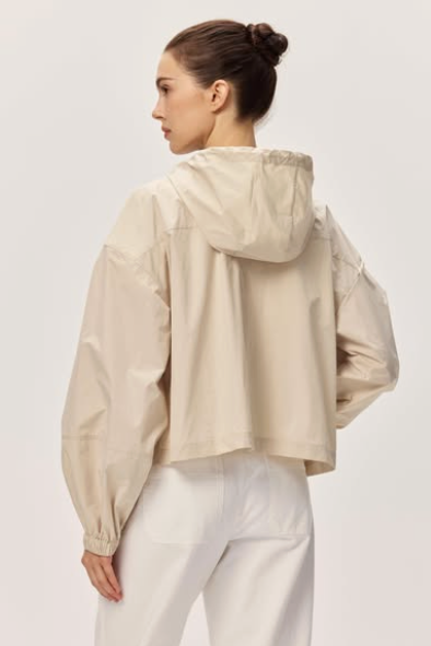The Lira Jacket is a versatile lightweight windbreaker in soft taupe that moves with you. Featuring a practical hood for unexpected weather and two front pockets for essentials, this slightly cropped silhouette offers a modern, flattering fit. Perfect for layering on cool days or wearing solo during mild weather, it's an effortless addition to any wardrobe.