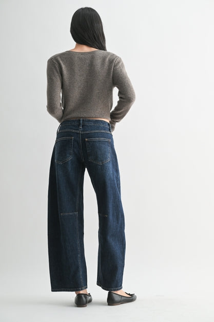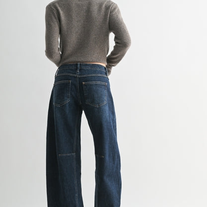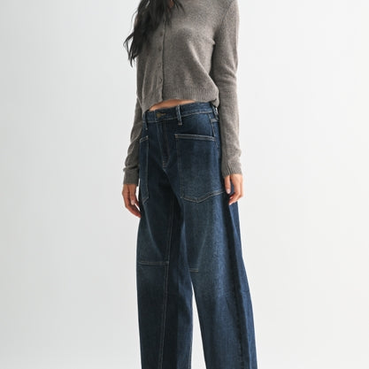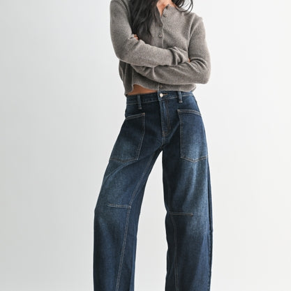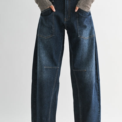Step into playful style with these Patch Pocket Barrel jeans in dark denim. Featuring a comfortable 10" rise and a versatile 28" inseam, they blend classic denim vibes with a fun, casual fit. The standout patch pockets add a quirky twist that makes these jeans perfect for your everyday adventures.