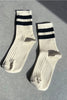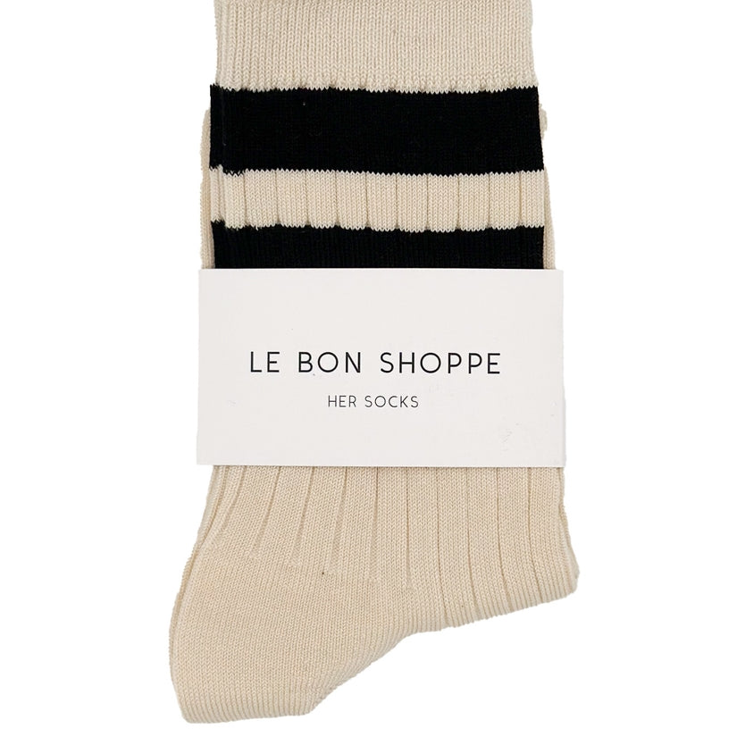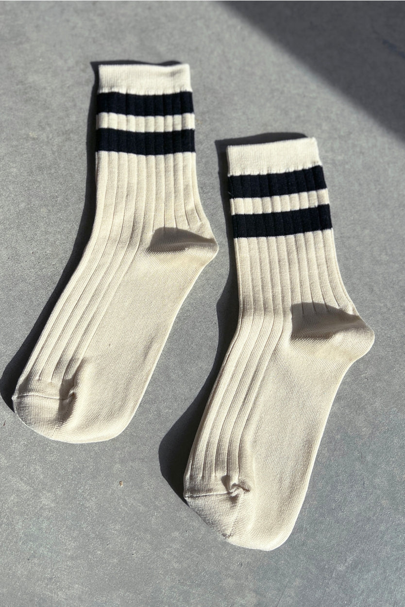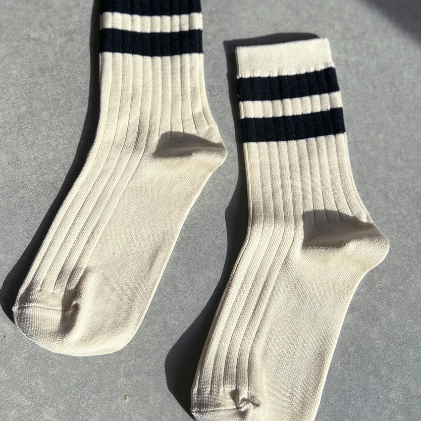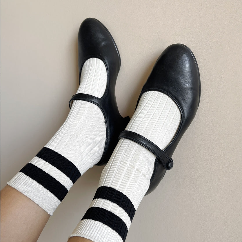 A bold varsity stripe is timeless and always a classic. Her Varsity Socks is a varsity striped version of our OG Her Socks which are classically ribbed, perfect height, cotton blend durable, chic go to socks. Add an understated sporty touch to any look with this bold stripe contrast version of Her Socks. She loves to be worn with a mini skirt, plaids, and oversized cable knit sweaters.