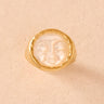 This luminescent mother-of-pearl moonface statement ring captures the serene glow of a full moon. Its carved moon face is set in a golden setting and reflects light with peaceful tranquility.
