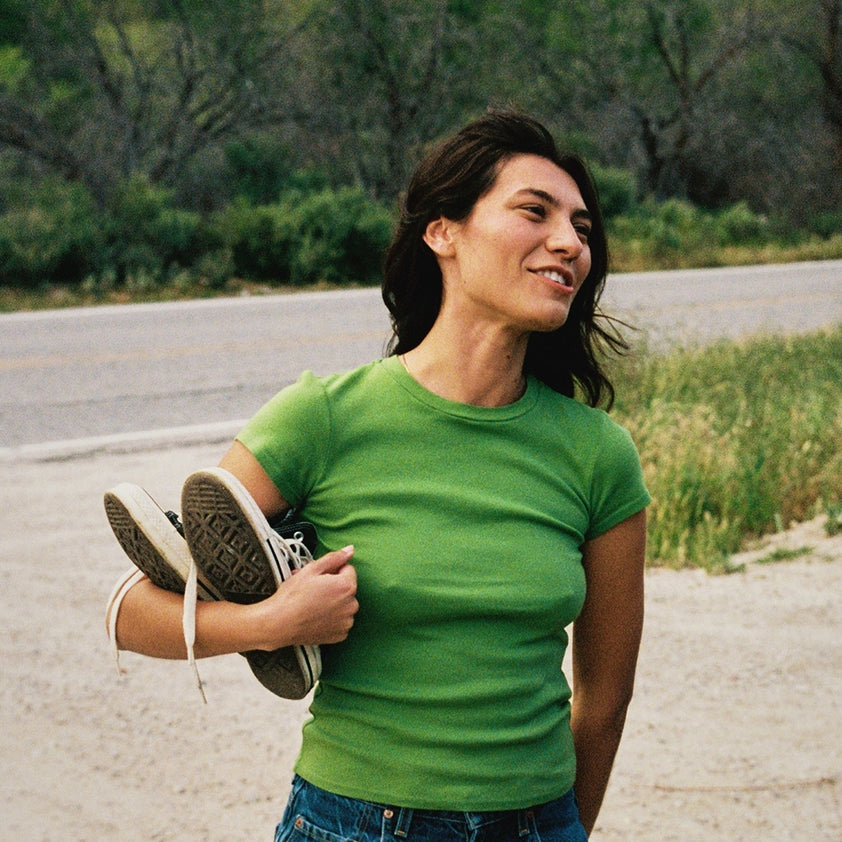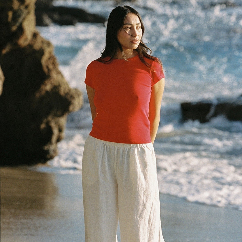 The perfect shrunken crewneck tee. Features cap sleeves and a slightly cropped length. Garment dyed and pre-shrunk.