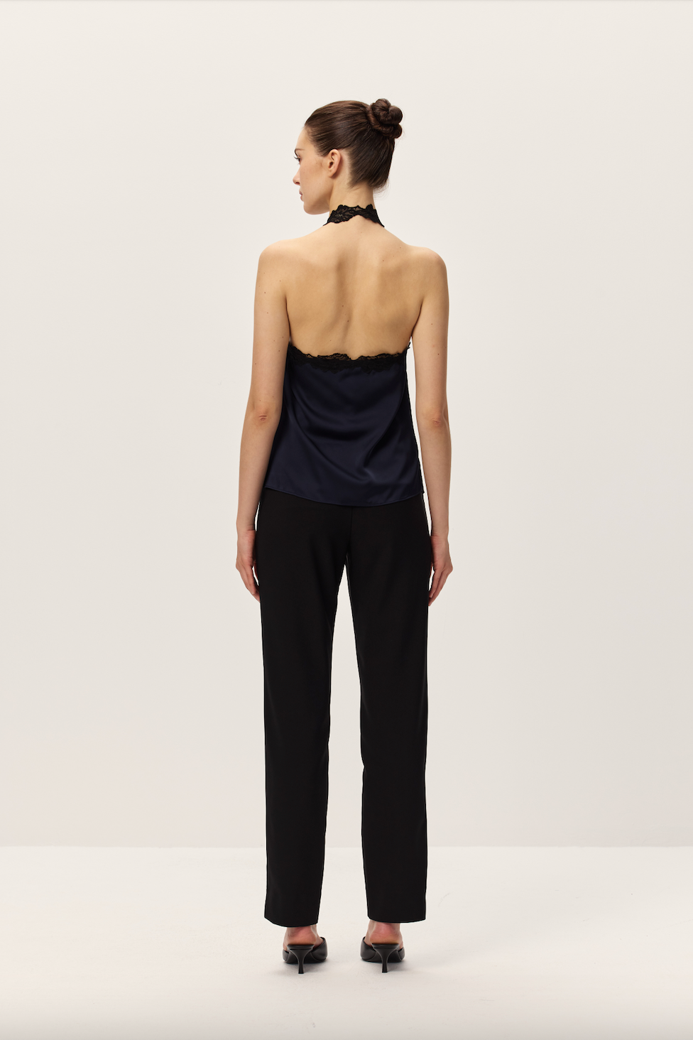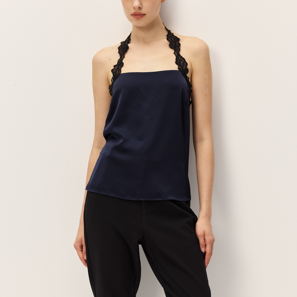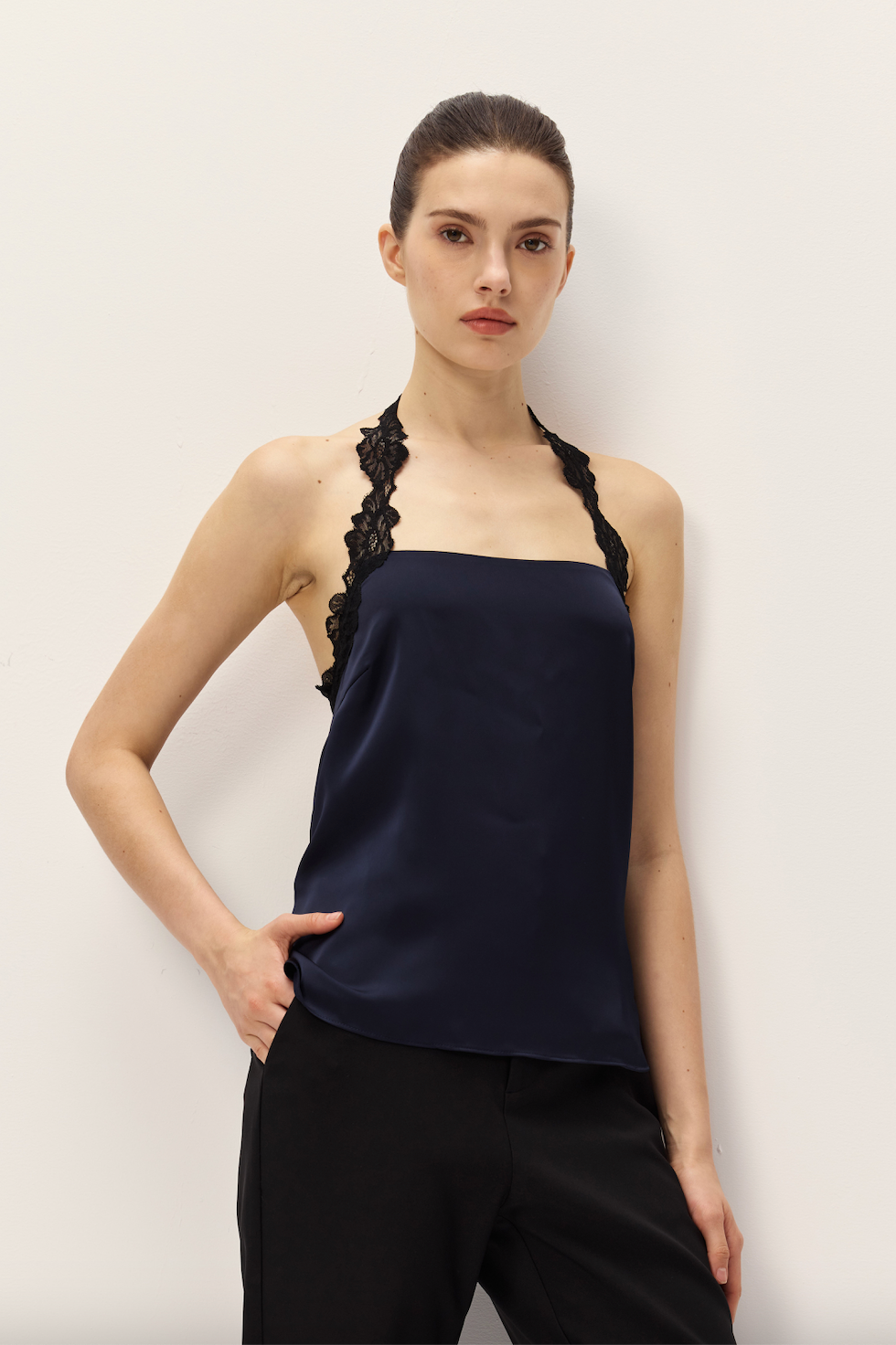 The Elowen Top is your new go-to for effortless elegance with a flirty twist. This navy satin tank features delicate black lace halter straps that add just the right amount of sass and sophistication. Perfect for date nights, brunch with friends, or whenever you want to feel polished yet playful. The smooth satin drapes beautifully while the lace details keep things interesting. Dress it up with heels or down with your favorite jeans—this versatile piece does it all.