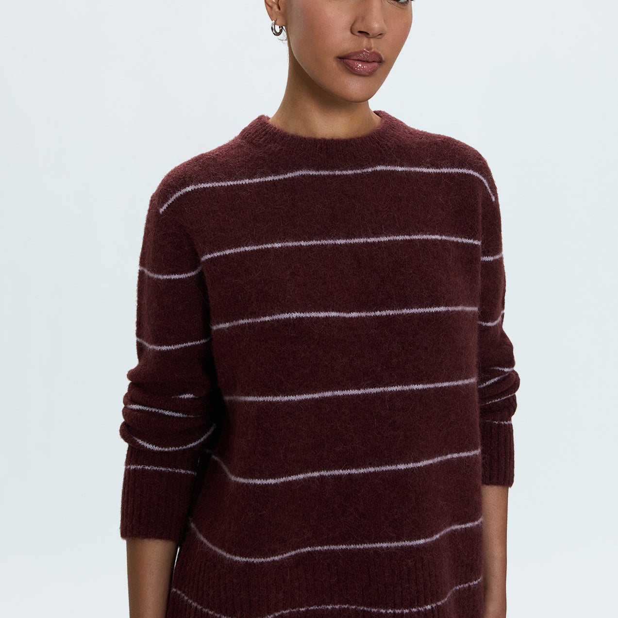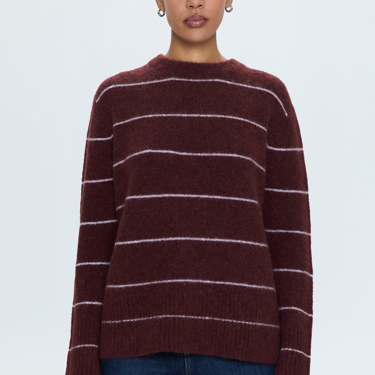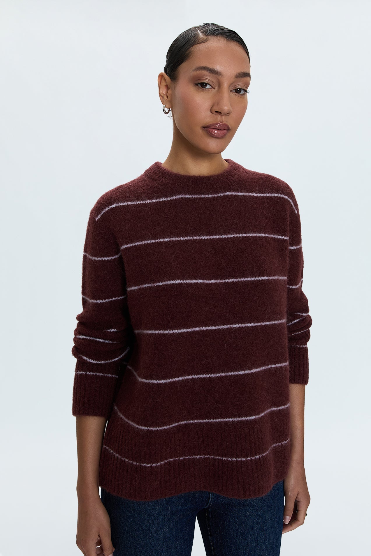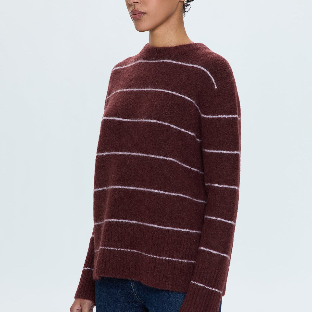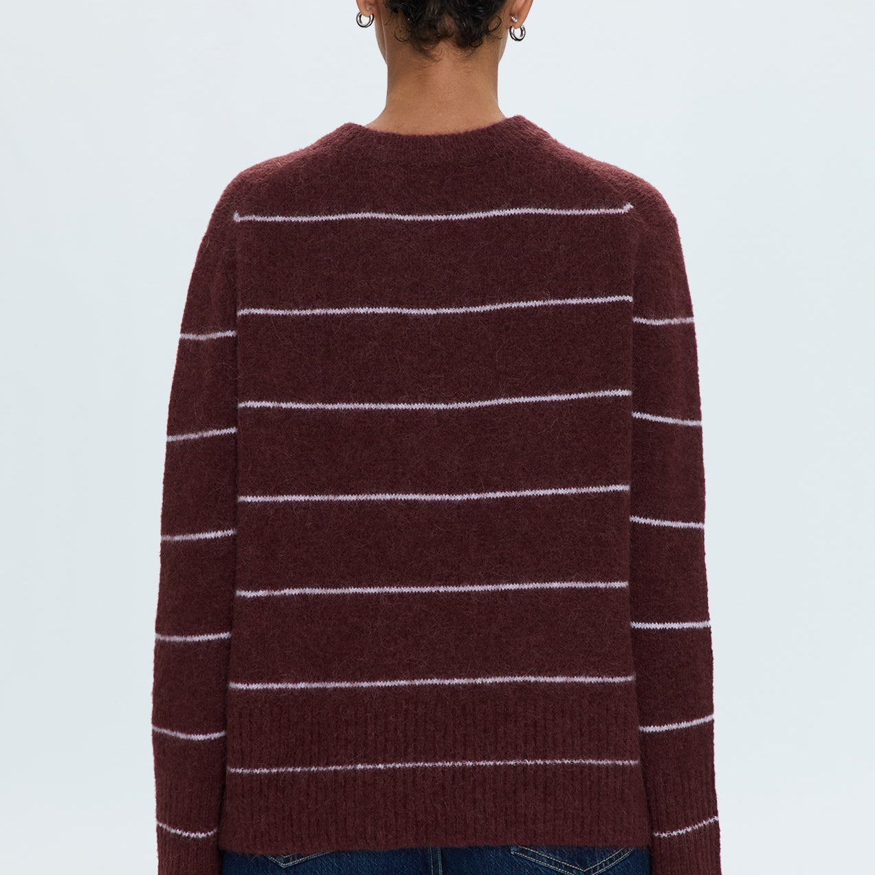 Medium weight wool knit blend with an ultra soft hand feel. Crafted into a classic pullover sweater silhouette with a crew neckline, dropped shoulders, and long sleeves. Relaxed, elongated ribbing on sleeves, neckline, and hem. Terra Stripe is a warm, reddish brown clay hue with contrast light pink horizontal striping.