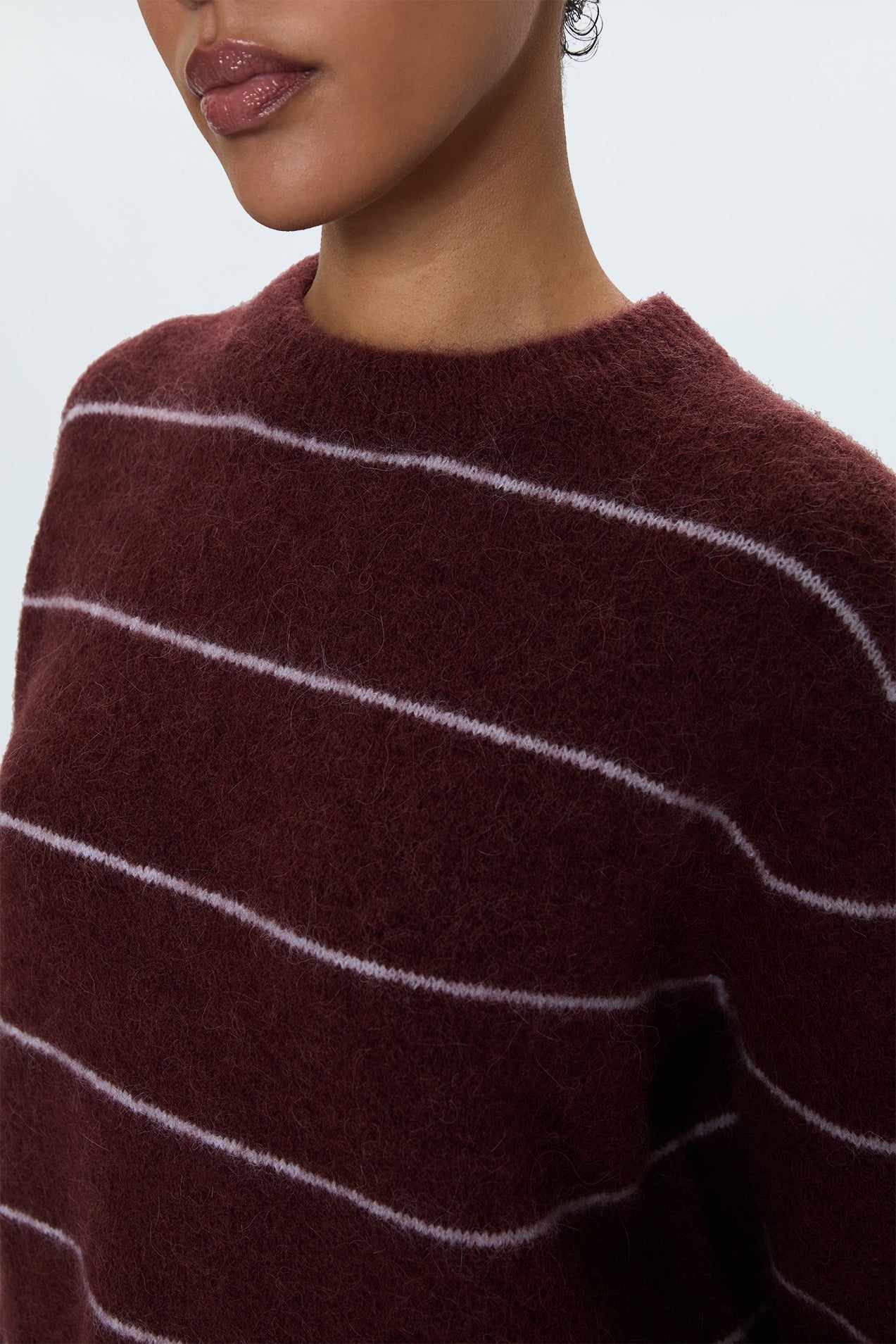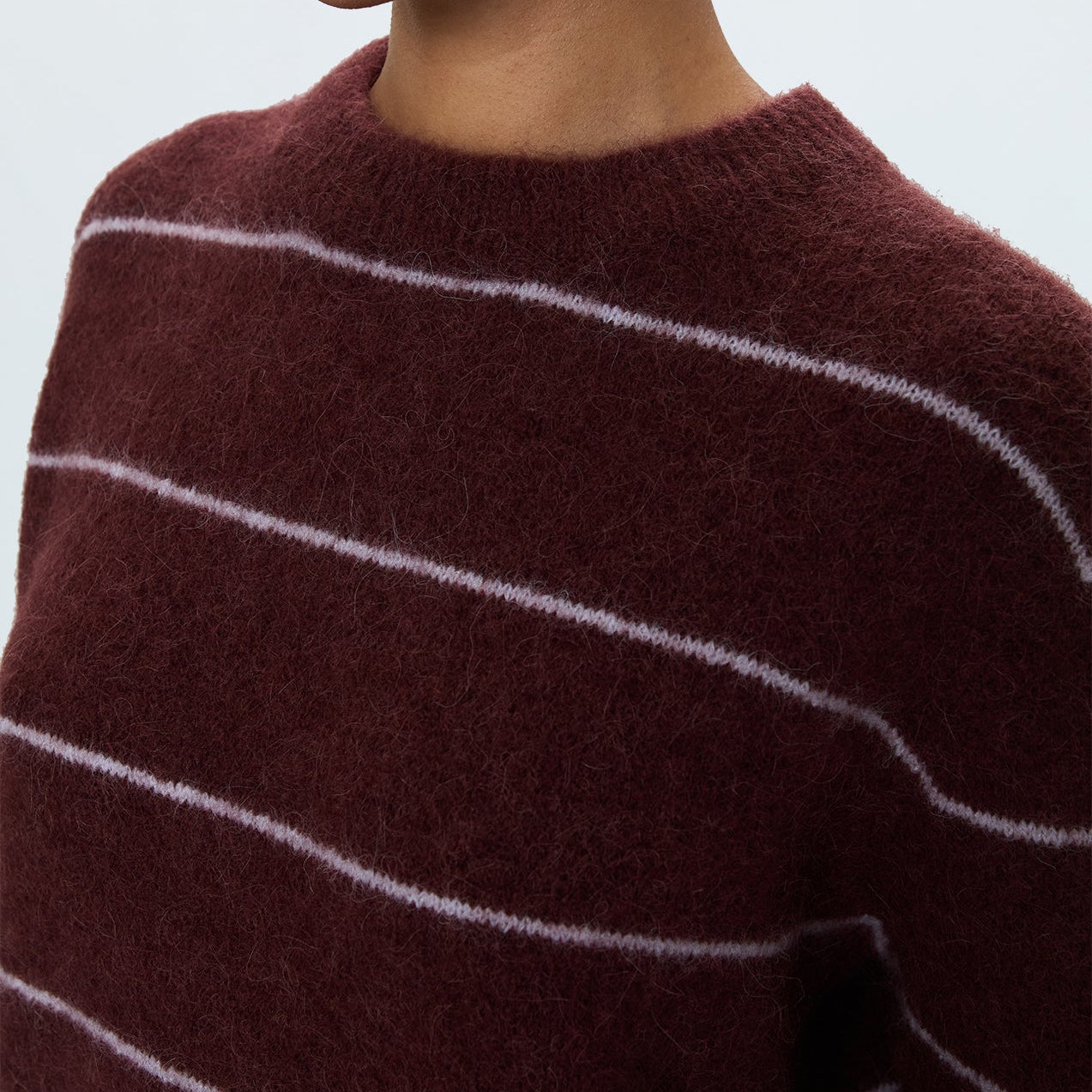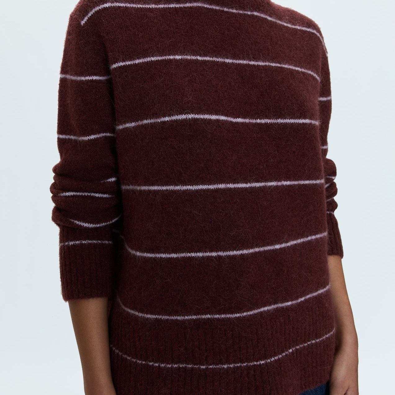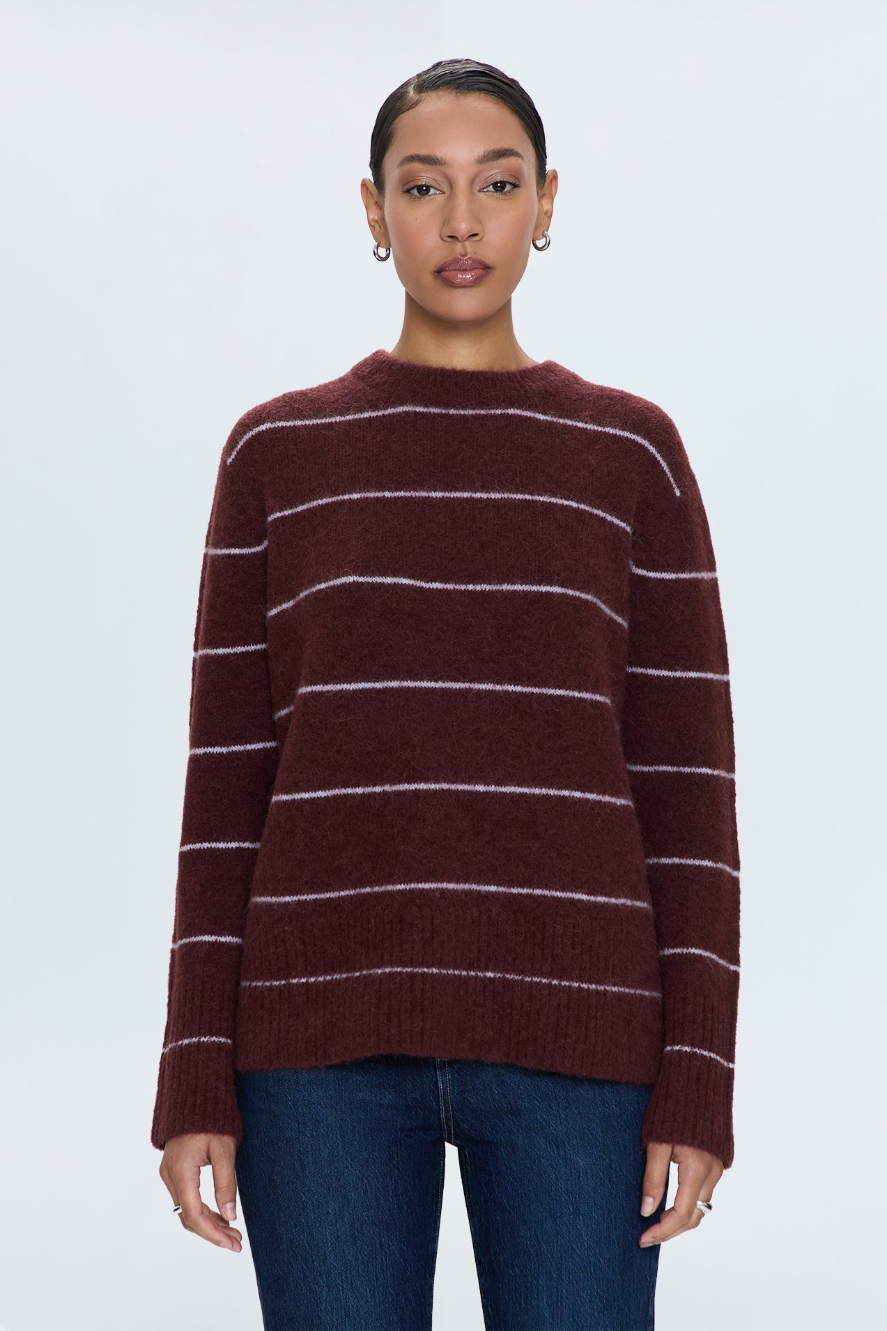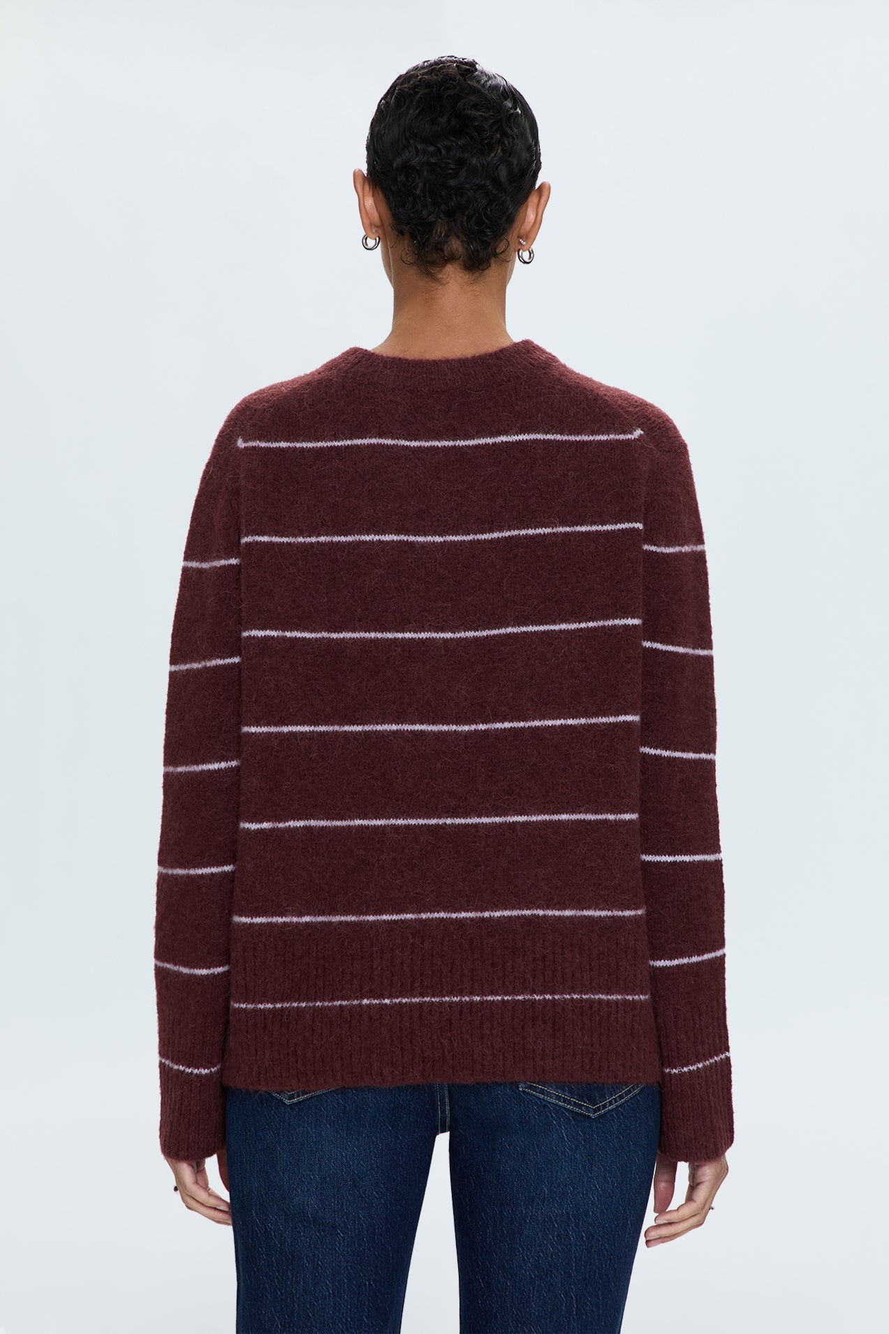Medium weight wool knit blend with an ultra soft hand feel. Crafted into a classic pullover sweater silhouette with a crew neckline, dropped shoulders, and long sleeves. Relaxed, elongated ribbing on sleeves, neckline, and hem. Terra Stripe is a warm, reddish brown clay hue with contrast light pink horizontal striping.